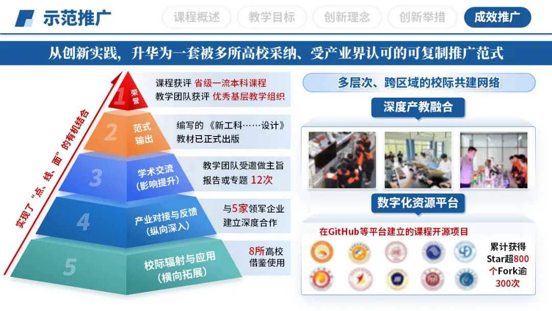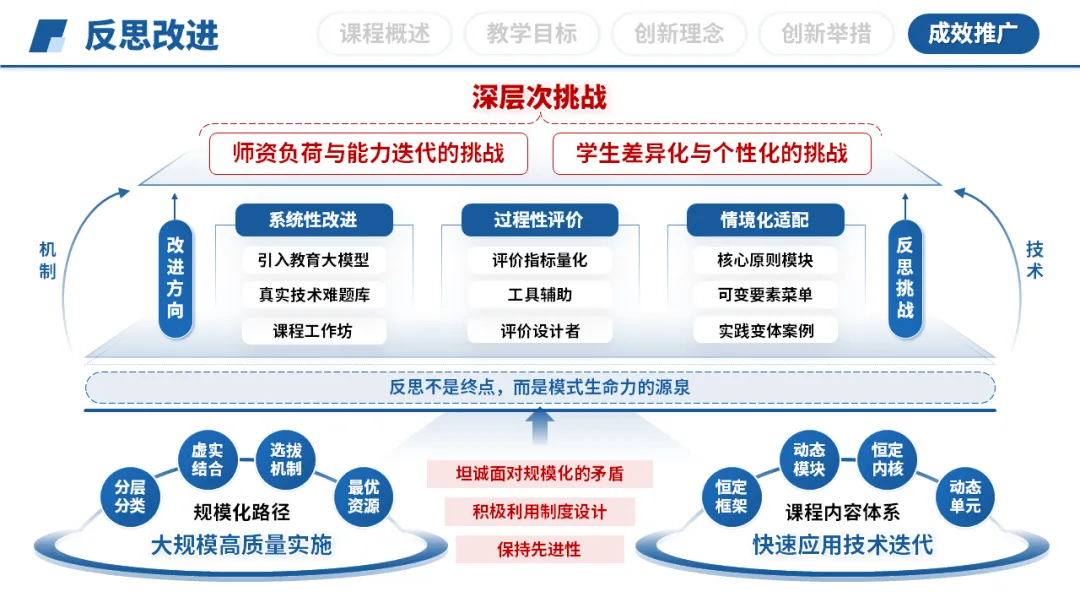 PPT 并未止步于现有成果,还突出了课程的可复制推广价值,展现了从校级探索到行业认可的跨越。同时坦诚分析师资负荷、学生差异化等深层次挑战,提出引入教育大模型、优化评价体系等改进方向,让整个教学创新故事更具深度与生命力。
