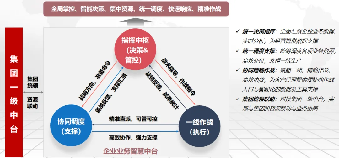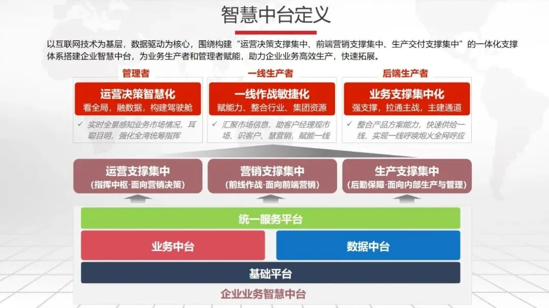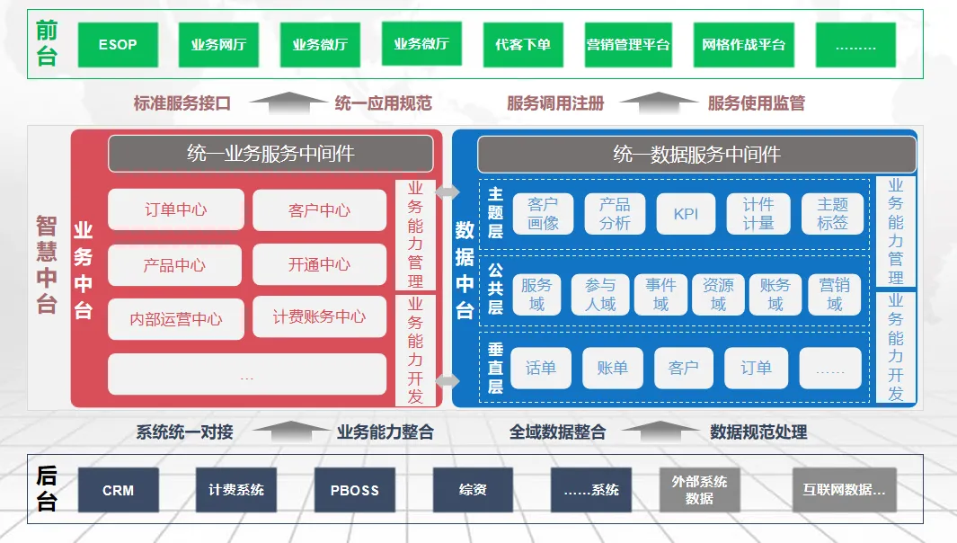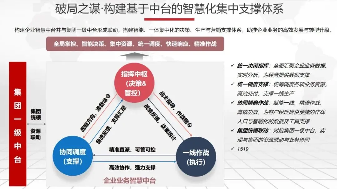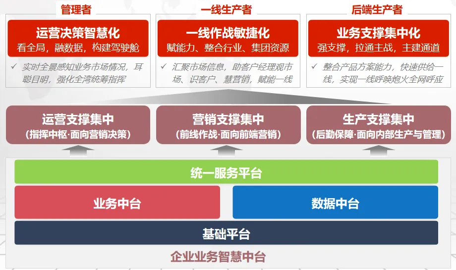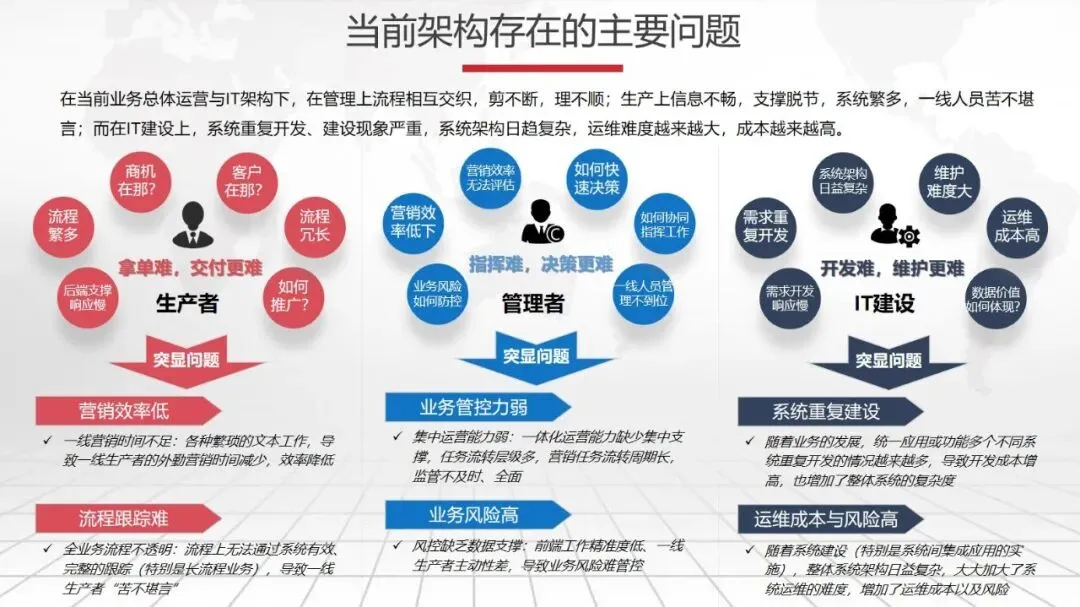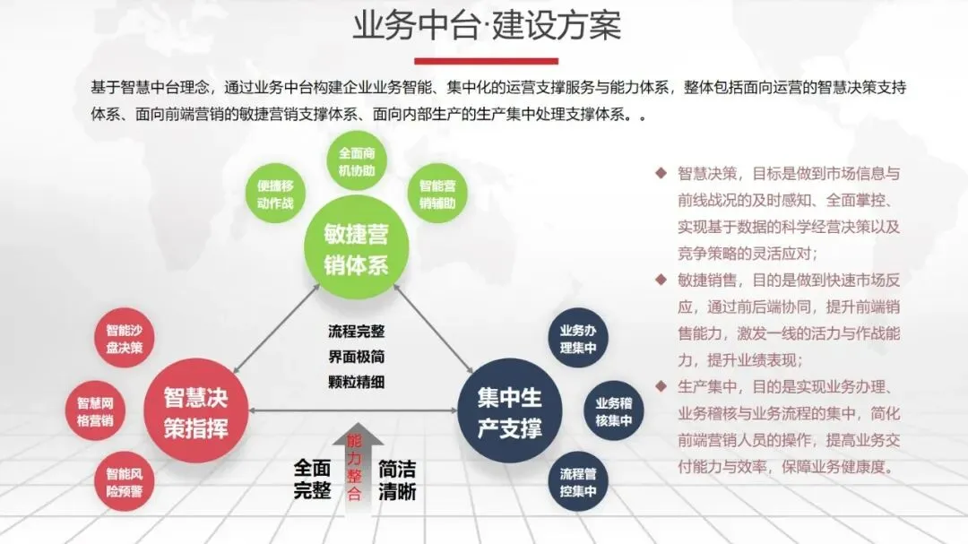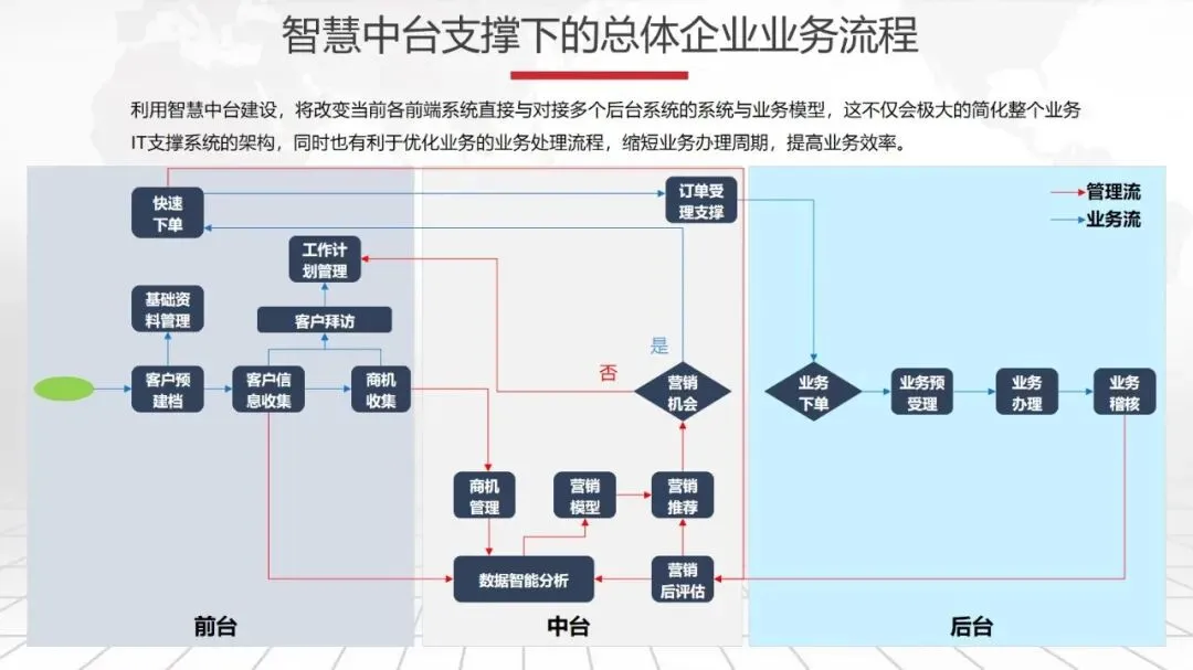 传统体系结构下的企业普遍存在着流程复杂繁琐,信息传输不畅,系统开发重复的问题:营销一线人员的时间被大量繁杂的文本工作占据,难以追踪整个业务流程;管理人员缺乏数据支持,导致决策滞后,业务控制不力;而 IT部门由于其系统结构的复杂性,导致了高的运行维护成本和缓慢的需求响应速度。为此,将“集中支撑、数字驱动”作为智能中台的核心理念,与集团一级中台进行联动,形成统一业务支撑门户,覆盖客户发现、商机跟进、服务提供、风险控制等全过程。