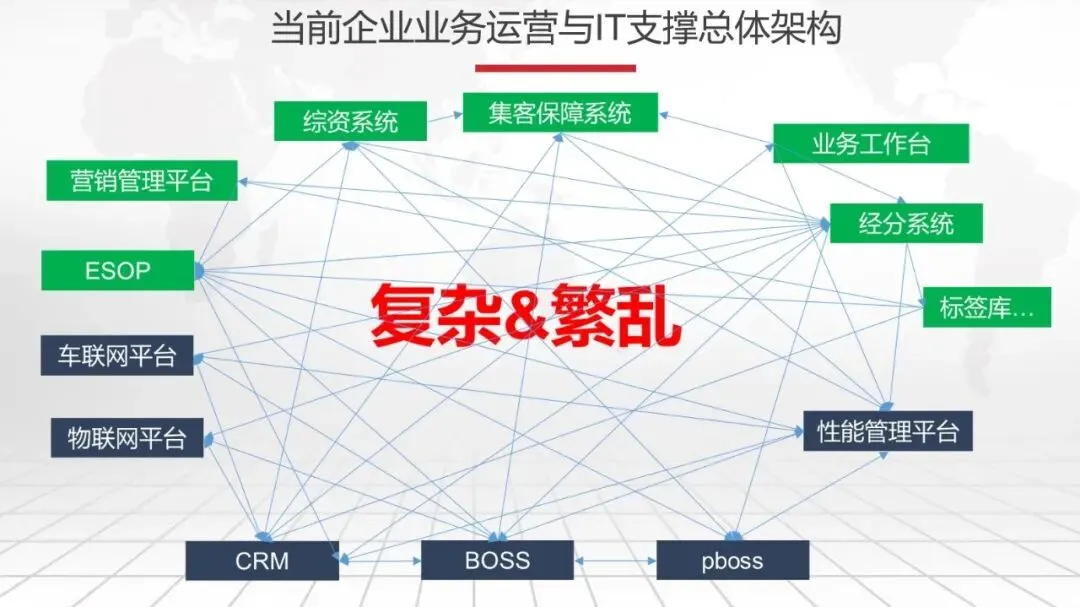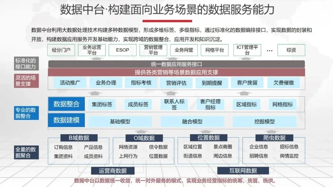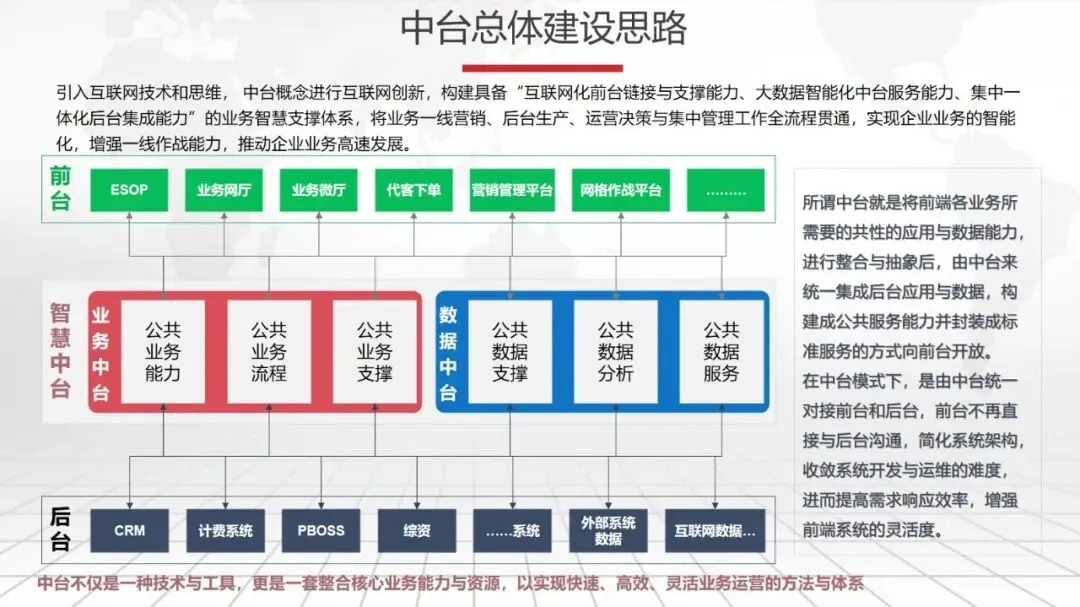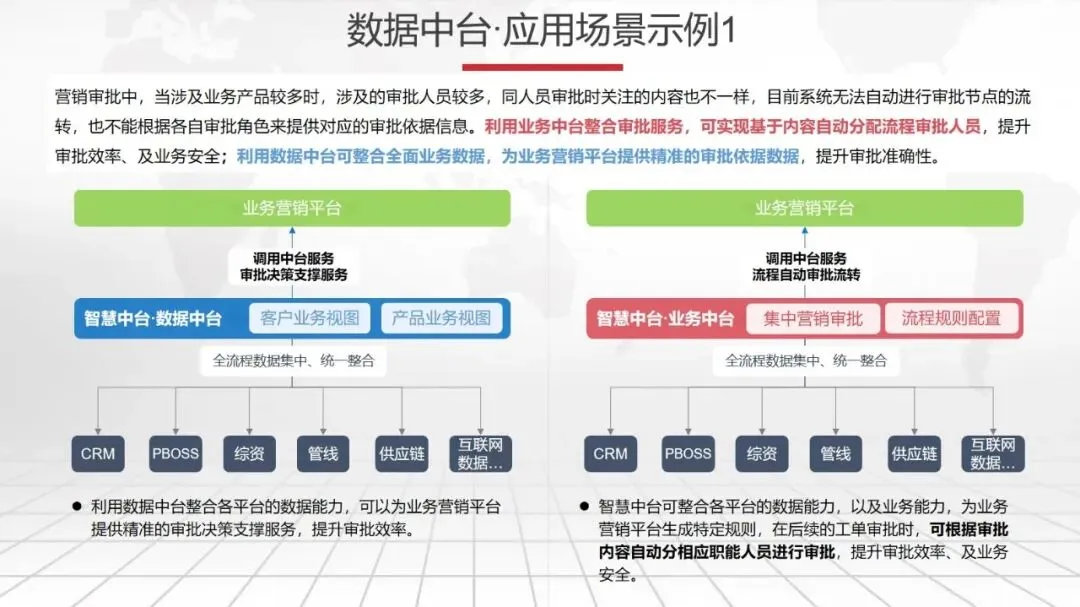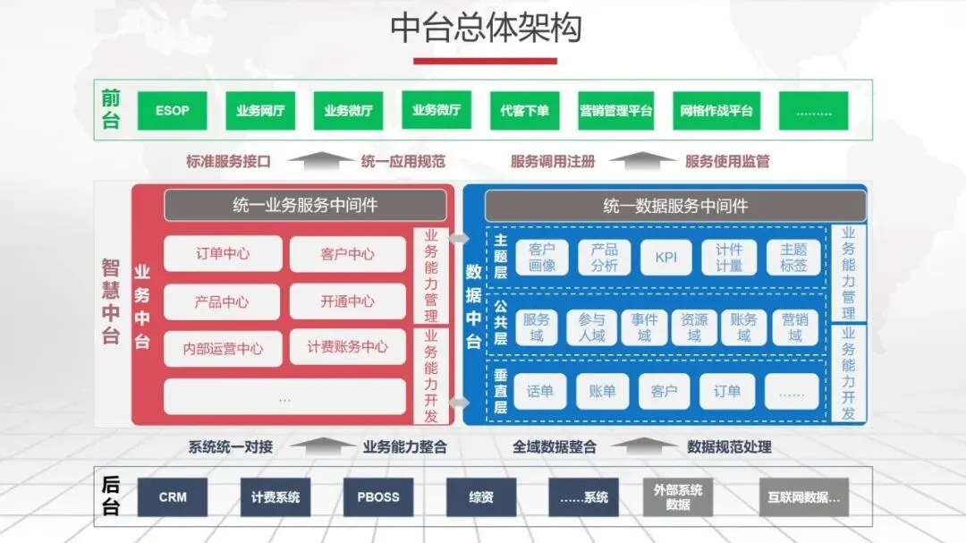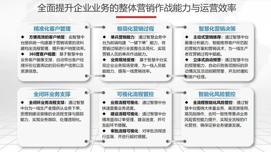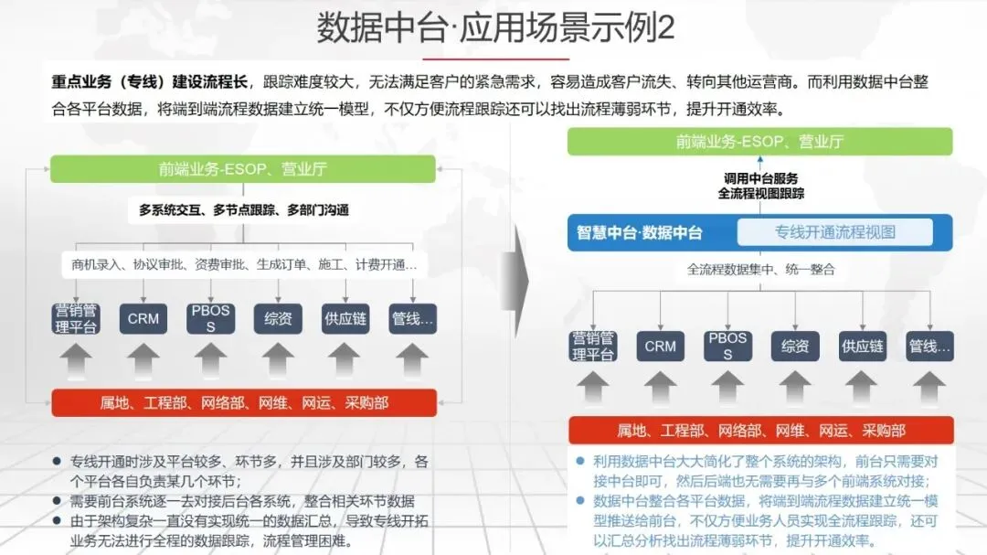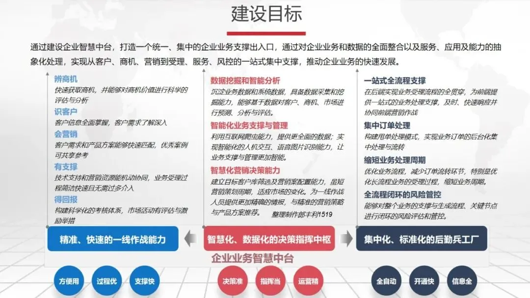 传统体系结构下的企业普遍存在着流程复杂繁琐,信息传输不畅,系统开发重复的问题:营销一线人员的时间被大量繁杂的文本工作占据,难以追踪整个业务流程;管理人员缺乏数据支持,导致决策滞后,业务控制不力;而 IT部门由于其系统结构的复杂性,导致了高的运行维护成本和缓慢的需求响应速度。为此,将“集中支撑、数字驱动”作为智能中台的核心理念,与集团一级中台进行联动,形成统一业务支撑门户,覆盖客户发现、商机跟进、服务提供、风险控制等全过程。