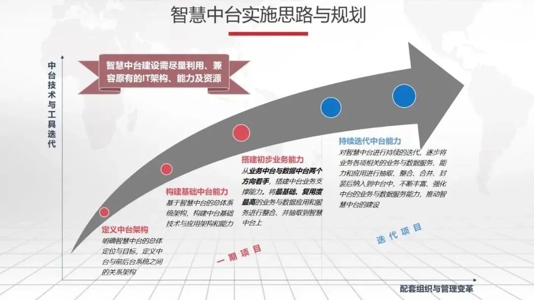 方案采取分期建设的模式,第一阶段构建基础设施和核心能力,实现业务和数据服务的高度集成和重用;后续,通过不断迭代的方式,将更多的业务能力逐步整合进来,同时配合组织和管理上的变化,与原有的IT资源相兼容。