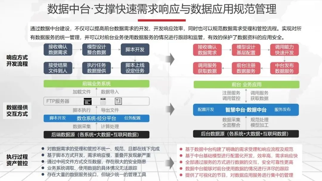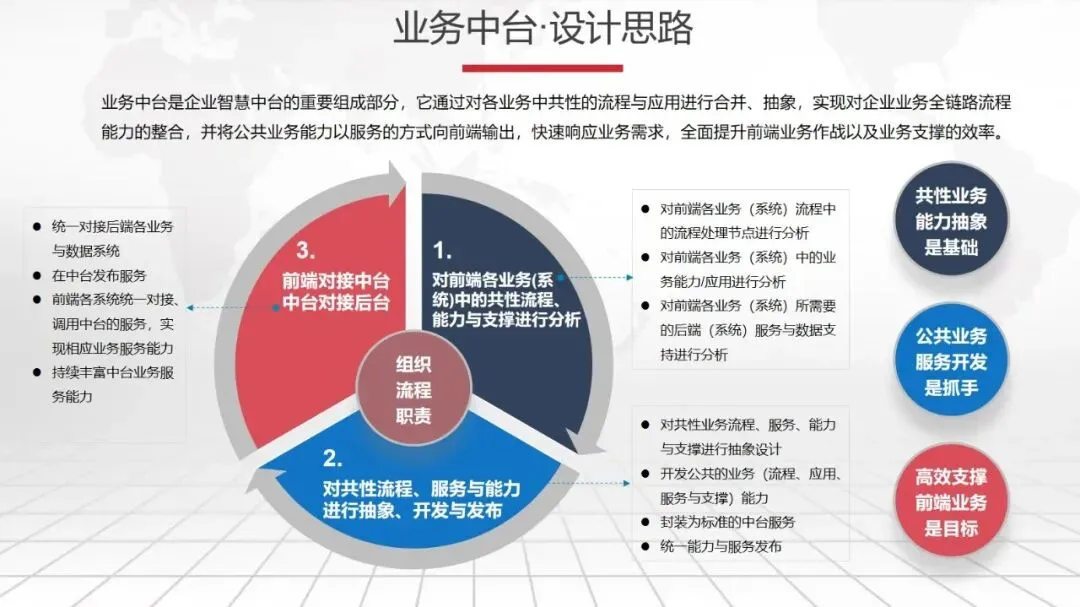 业务中台将重点放在通用的业务功能上,对订单管理和客服等通用的业务流程进行抽象和集成,并以统一的服务界面输出到前端,支持“一键下单”、“现场受理”等灵活的销售场景,从而简化前端的业务流程。数据中台将企业的全域数据和网络数据进行整合,通过统一治理,形成客户特征图、市场指标等信息资源,为企业的精准营销和决策提供支持,有效地解决了企业“难以感知数据价值”的难题。技术中台依托基础平台,通过统一技术规格和服务登记机制,降低了系统间的对接链路、减少了开发和维护的难度、提高了通用模块的重用性。