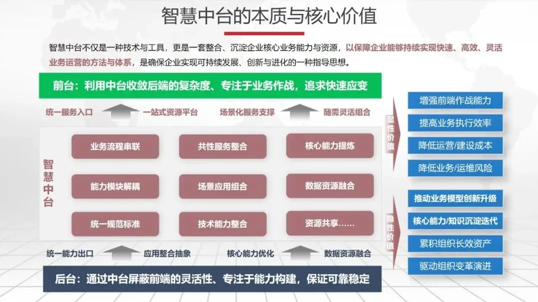 从应用价值来看,中台不但可以提高营销效率,缩短业务流程,降低运营和IT成本,而且可以通过对业务流程的可视化管理和对风险的智能化控制来保证业务的正常运行;从长远来说,它可以促进商业模式的革新、核心能力的沉淀和以数据为导向的商业成长,使企业能够在数位化的竞争中不断适应和演化。