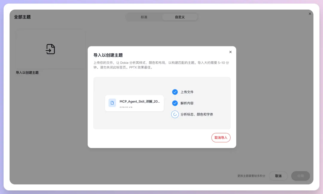 然后我又试了上传 PDF 、上传 YouTube 链接生成 PPT 。Dokie 支持导入自定义 PPT 模板,我直接用一个 Claude 风格的 PDF 作为风格模板上传了。