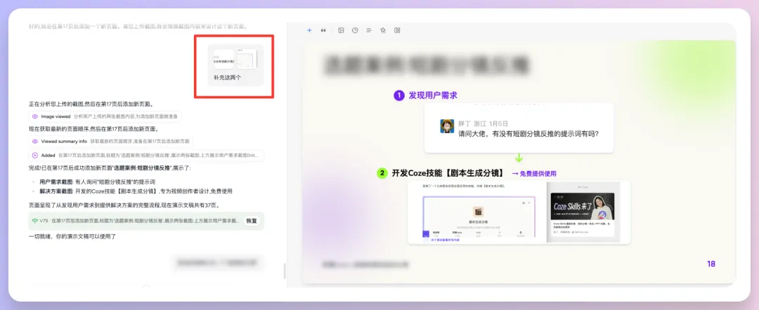 它首先会生成大纲,生成以后,我左边对话那里告诉它需要添加的内容,它会直接添加在符合逻辑的位置。