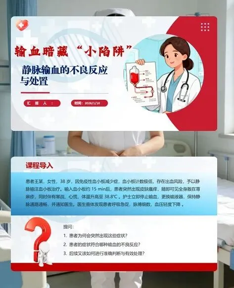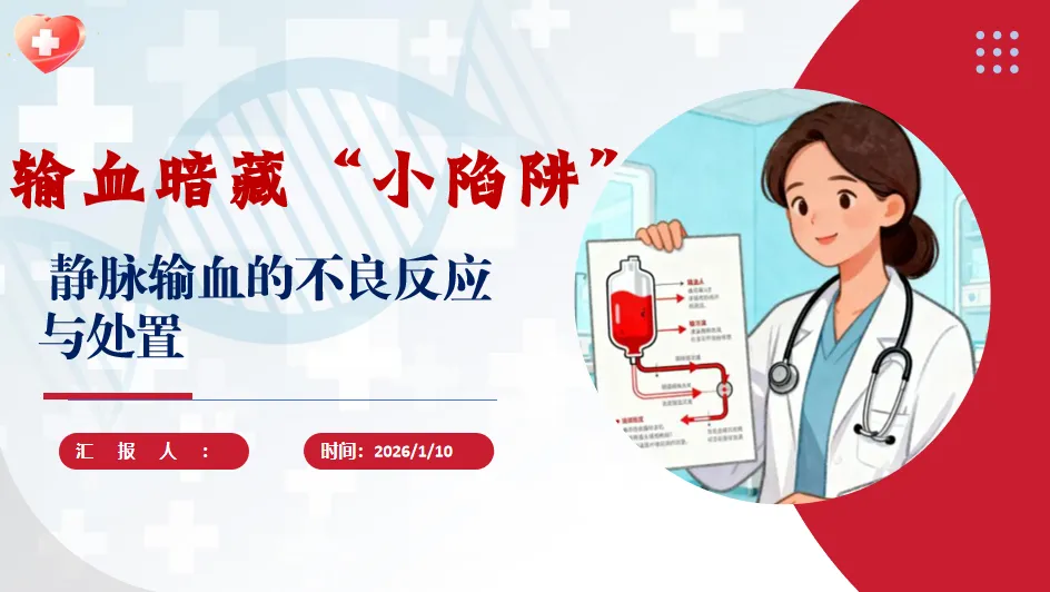 各位实习护士同仁,大家好!今天咱们聚焦静脉输血这个临床核心操作,聊聊那些暗藏的 “小陷阱”—— 不良反应与处置方法。输血是挽救患者生命的重要手段,但稍有不慎就可能引发风险,这就要求咱们每一步都走得扎实,把专业技能刻在心里。