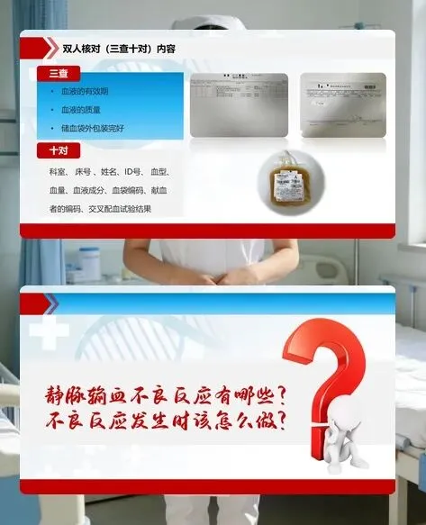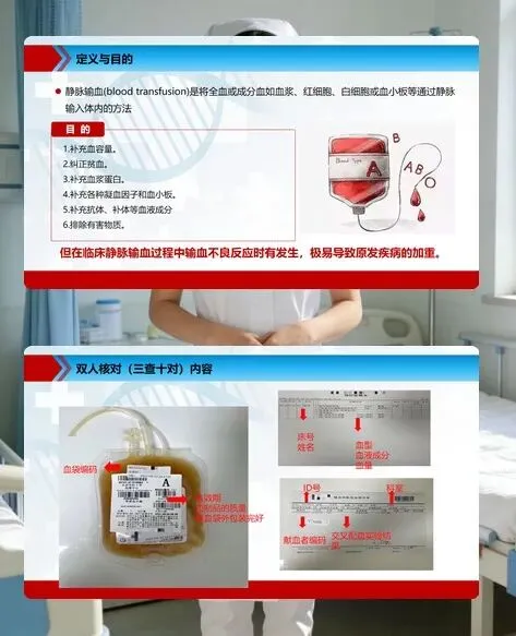 先说说静脉输血的基础认知。它是将全血或成分血输入体内的治疗方式,能补充血容量、纠正贫血等,但不良反应时有发生,可能加重原发疾病。这就需要咱们牢记 “三查十对”:查血液有效期、质量、储血袋包装,对科室、床号、姓名等关键信息,双人核对不能有丝毫马虎。