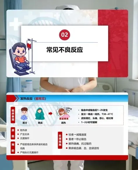 临床中最常见的是发热反应,输血中或输血后 1-2 小时,患者可能出现发冷、寒战、高热等症状,多由致热源、抗体或无菌操作不当引起。咱们要严格把控血制品和用具质量,执行无菌操作;出现反应后,轻者减慢速度,重者立即停止输血,对症用药并送检相关物品。