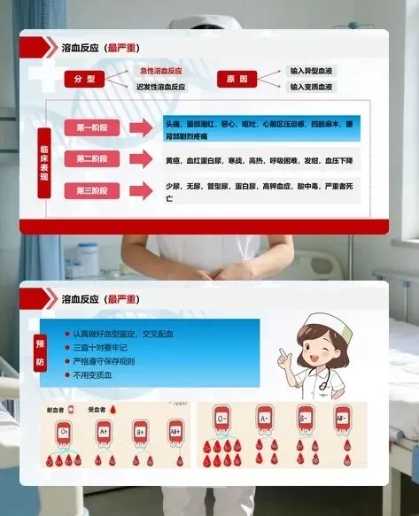 最严重的是溶血反应,多因输入异型血或变质血导致,分急性和迟发性,严重时会危及生命。预防的关键是做好血型鉴定和交叉配血,严格遵守血液保存规则;一旦发生,要立即停止输血,通知医生,送检剩余血液和患者血尿,做好保护肾脏、碱化尿液等抢救措施。