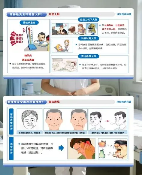 面神经炎专挑特定人群 “下手”。慢性病患者、免疫力低下的熬夜党、产后虚弱的女性,还有常受冷风刺激的人,都是高危群体。咱们在护理时要多留意这类患者,主动提醒预防要点,比如糖尿病患者要控制好血糖,加班多的年轻人要注意休息,从源头降低发病风险。