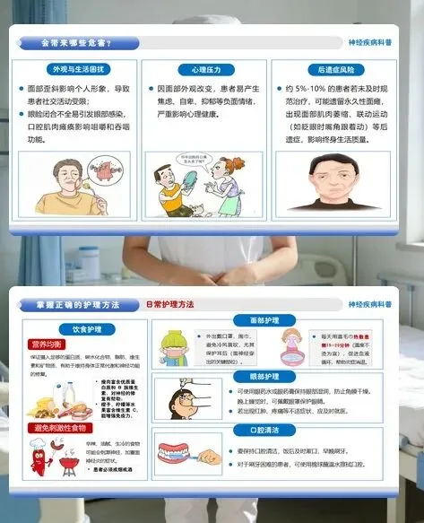 今天咱们聚焦面神经炎这个常见疾病,聊聊它的预防与护理要点。面神经炎俗称 “面瘫”,看似突然发作,实则和生活习惯、身体状态息息相关。护理工作既要帮患者缓解不适、促进康复,更要做好预防科普,让 “歪脸” 少突袭。
