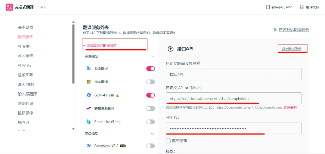 打开设置->点击翻译设置->自定义翻译服务->填写接口地址和API-key->点击测试✅