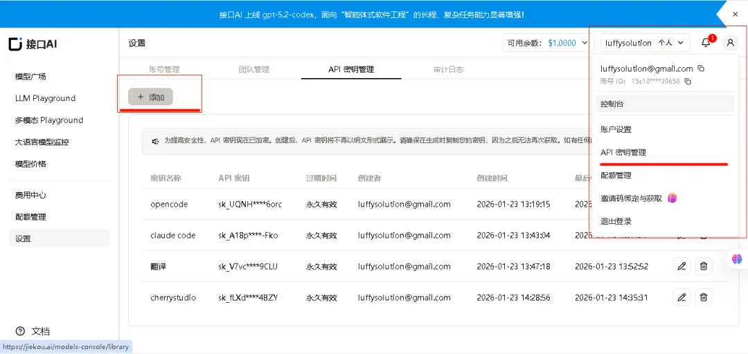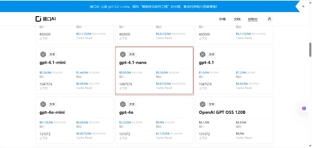 这里我以接口官网https://jiekou.ai/referral?invited_code=RY0K6I 为例,也可以换成你自己喜欢的第三方LLM中转API平台,选择一个便宜好用的翻译AI大模型,这里我选择的是GPT4.1nano模型