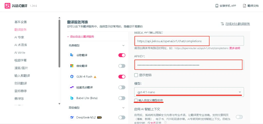 回到沉浸式翻译把刚刚获取的API-key进行配置