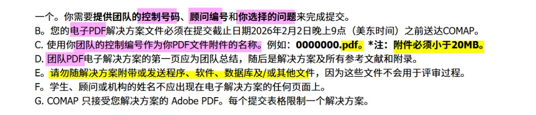 美赛要求 PDF 文件≤20MB,导出前可压缩图片分辨率(建议 150dpi)、删除文档冗余对象,避免因文件过大上传失败。