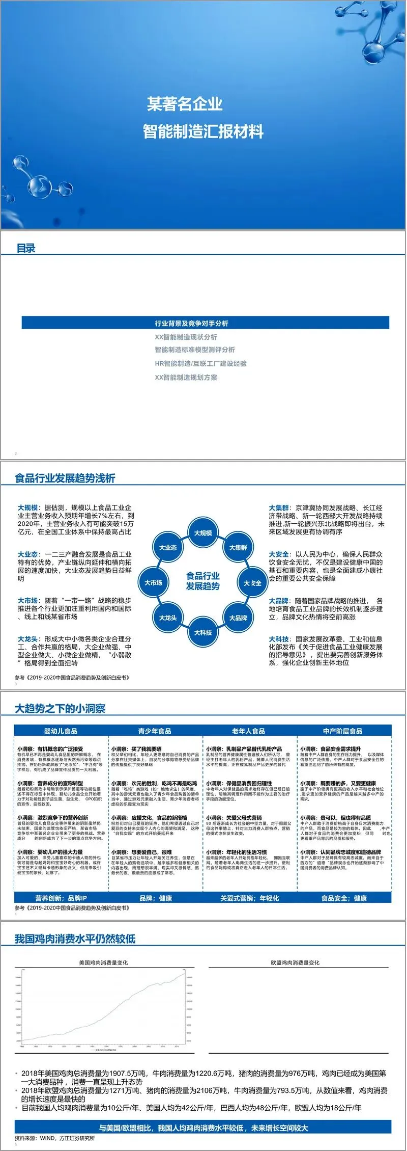 文件开篇从食品行业整体趋势切入,指出行业正朝着“大规模、大业态、大市场、大龙头”方向发展,主营业务收入持续增长,产业链融合加速。特别是在白羽鸡行业,我国人均鸡肉消费量远低于美国、巴西等国,市场潜力巨大。文件详细梳理了白羽鸡产业链结构,从上游养殖饲料,到中游屠宰加工,再到下游物流与终端消费,呈现了完整的产业图谱。