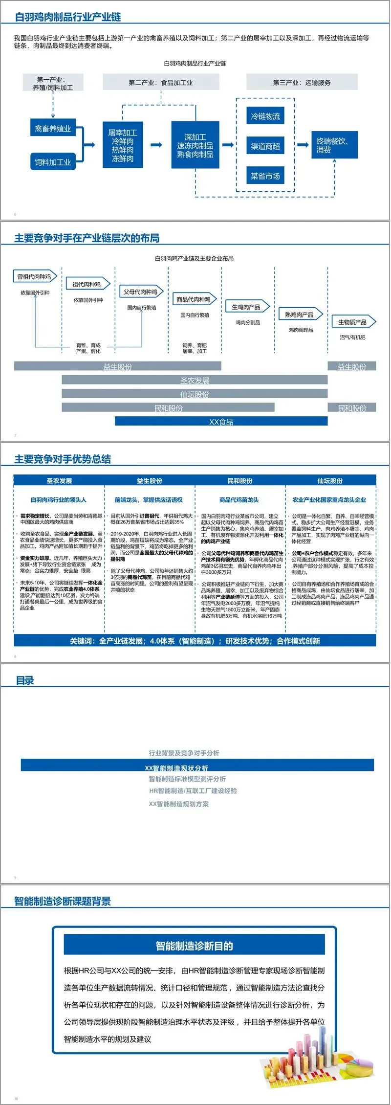 在竞争对手分析部分,文件列举了仙坛股份、圣农发展、民和股份、益生股份等主要企业,指出它们在产业链各环节的布局特点,并总结其核心优势集中在全产业链整合、智能制造体系、研发技术以及合作模式创新等方面。
