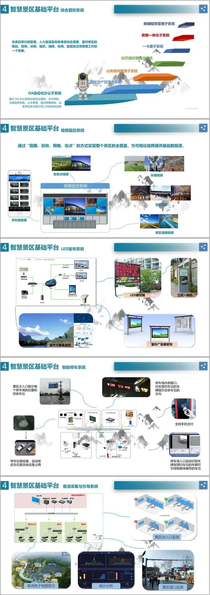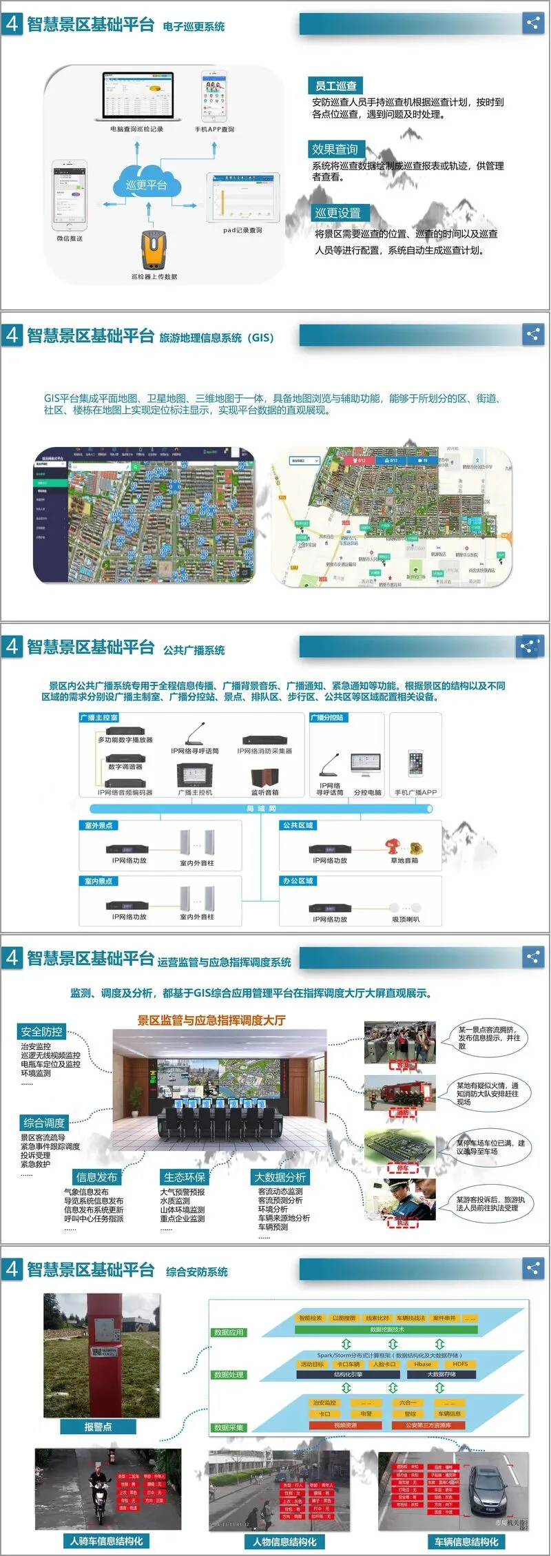 智慧景区基础平台涵盖了视频监控、LED信息发布、智能停车、客流采集、电子巡更、GIS地理信息系统、公共广播、应急指挥调度与综合安防等子系统,实现景区运营的全面数字化与自动化。
