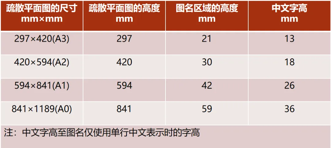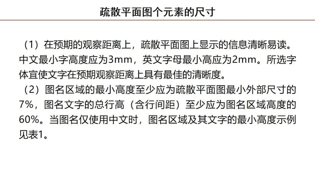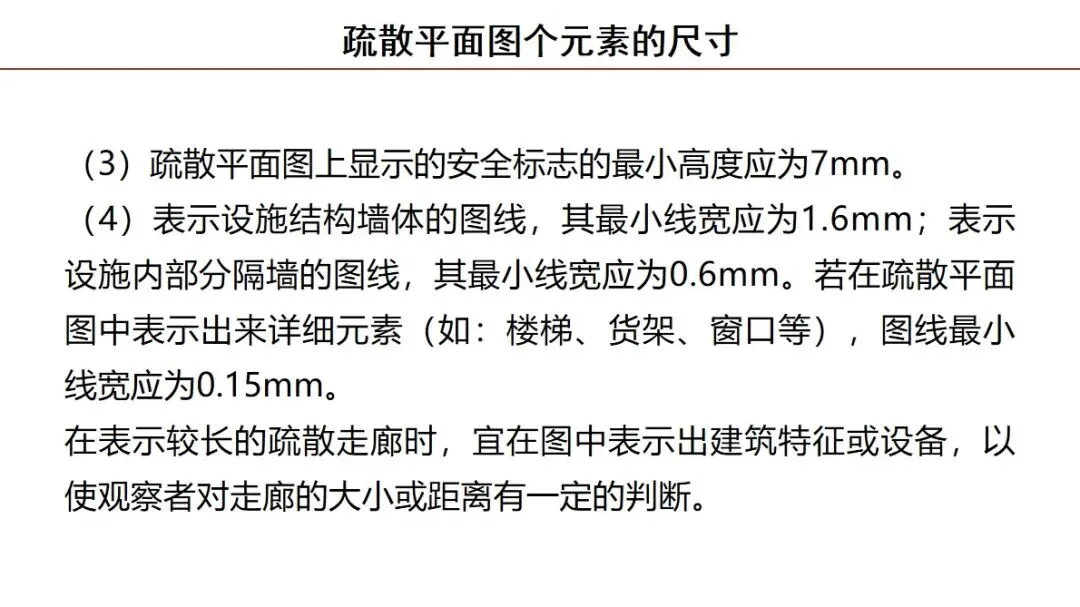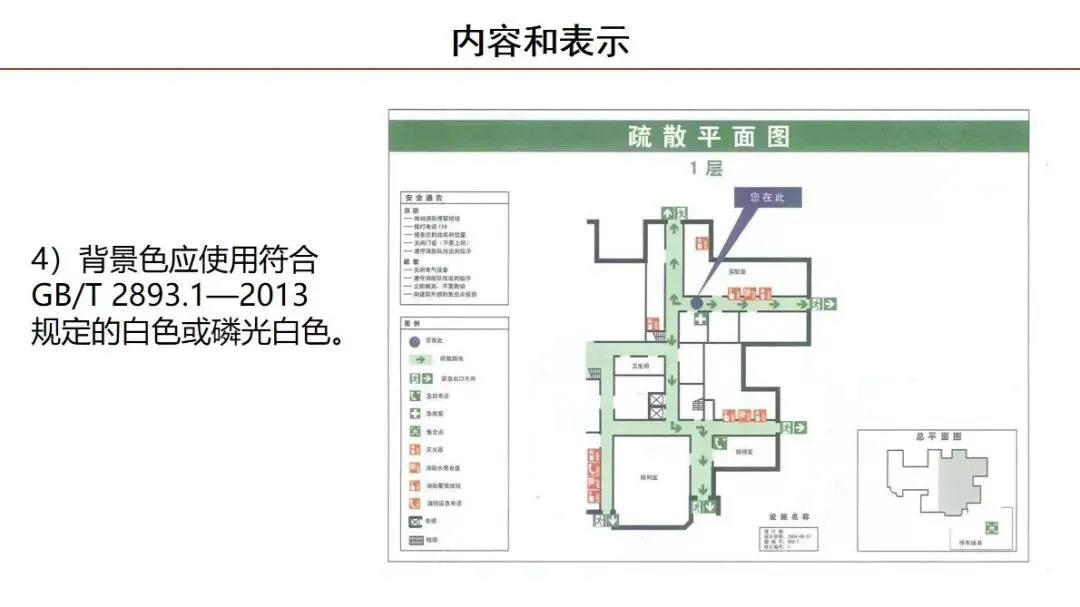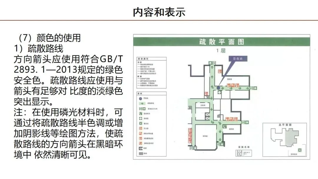 颜色和尺寸必须满足规格要求。疏散路线和方向箭头以绿色表示,观众位置以蓝色表示,背景以白色或荧光白表示,设施的结构轮廓以黑色表示,图名区域以绿色表示,文字以对比色表示。就元素大小而言,中文字符的最低高度为3毫米,英文字符的最低高度为2毫米,而安全标识的最低高度为7毫米;壁图线的宽度为1.6毫米,分隔壁的宽度为0.6毫米,细节元件的图线的宽度为0.15毫米。