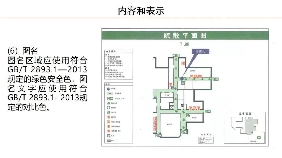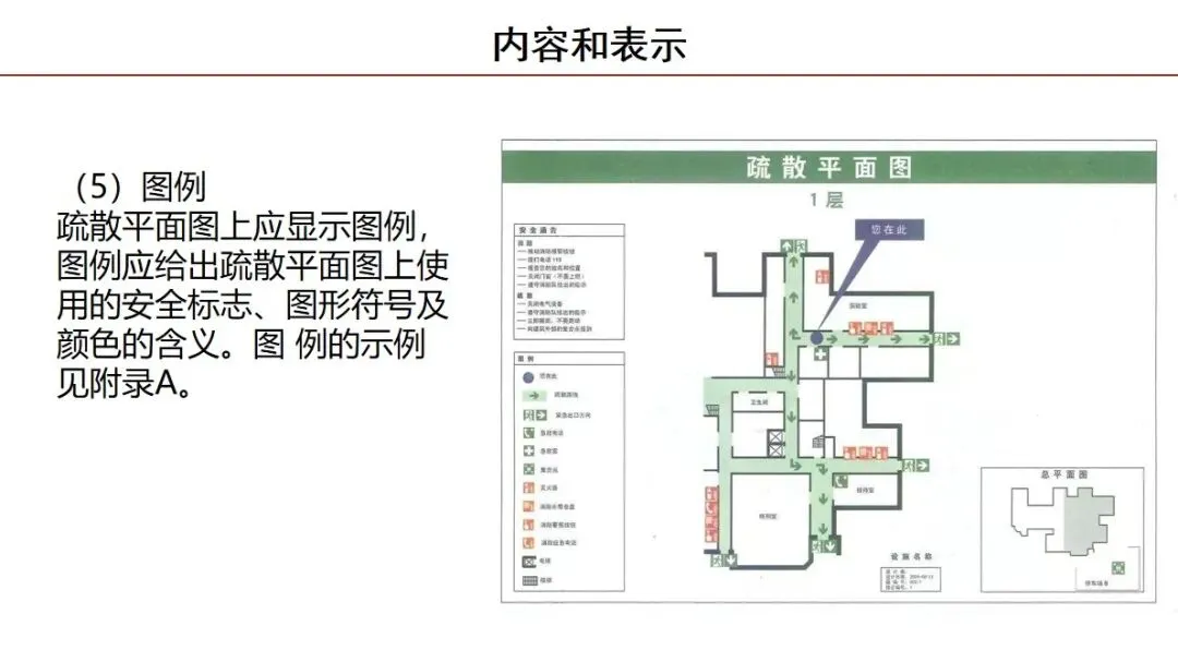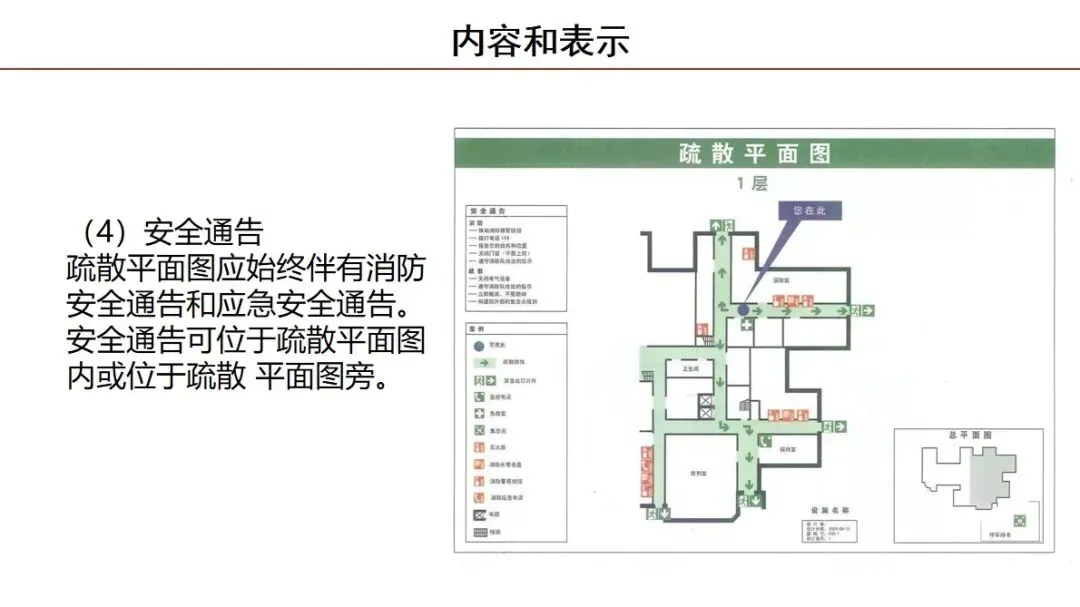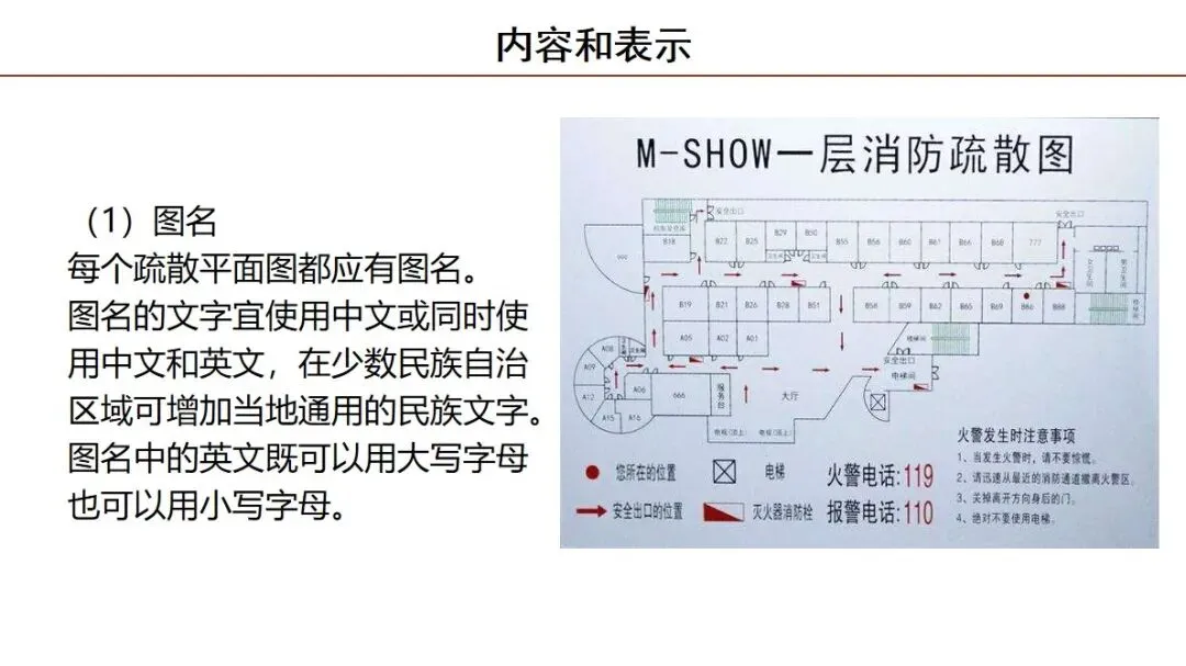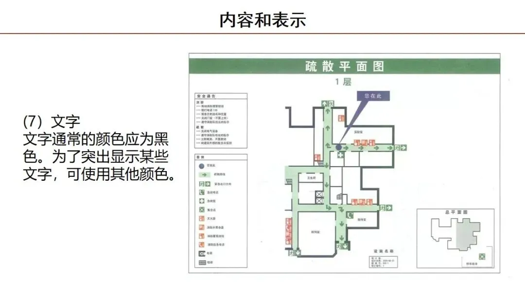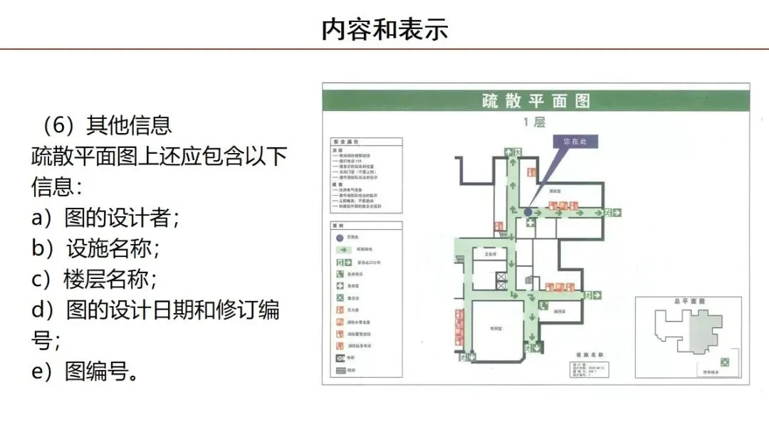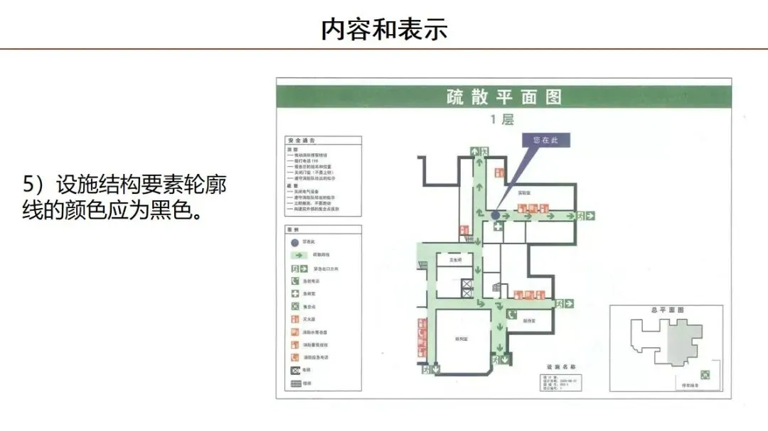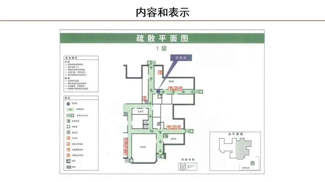 图的内容需要包括重要的元素。图名应包含“疏散方案”的中文说明,可以用英文或者民族语言表述;总平面布置图(不超过10%)应标注集合地点、设施概况、周边简图;疏散平面布置图以疏散平面布置图为主体,重点突出紧急出口,疏散路线,“您在此”标识,疏散楼梯,专用疏散设施和消防设备的位置。同时还需要配有安全告示(防火、应急说明)、说明(标识、符号的含义说明)、设计单位、设备名称、设计楼层、设计时间等。