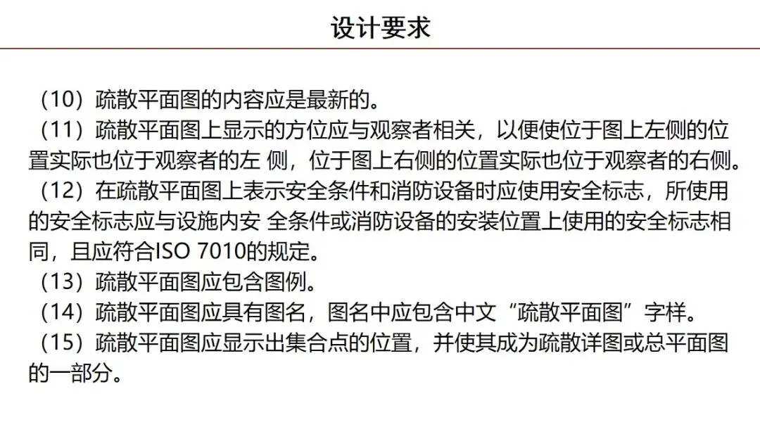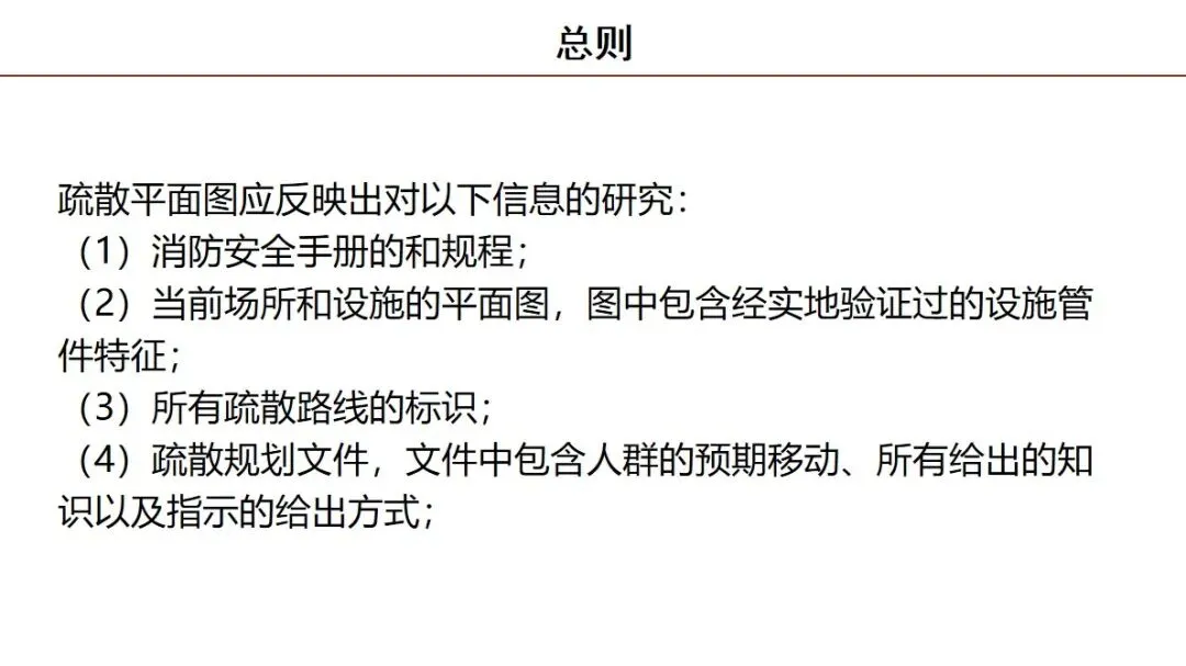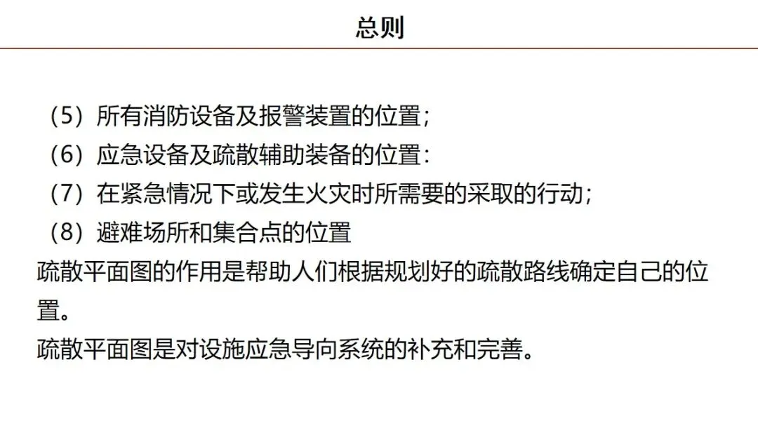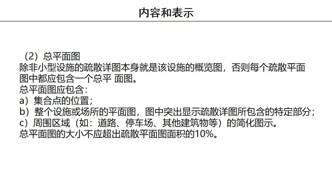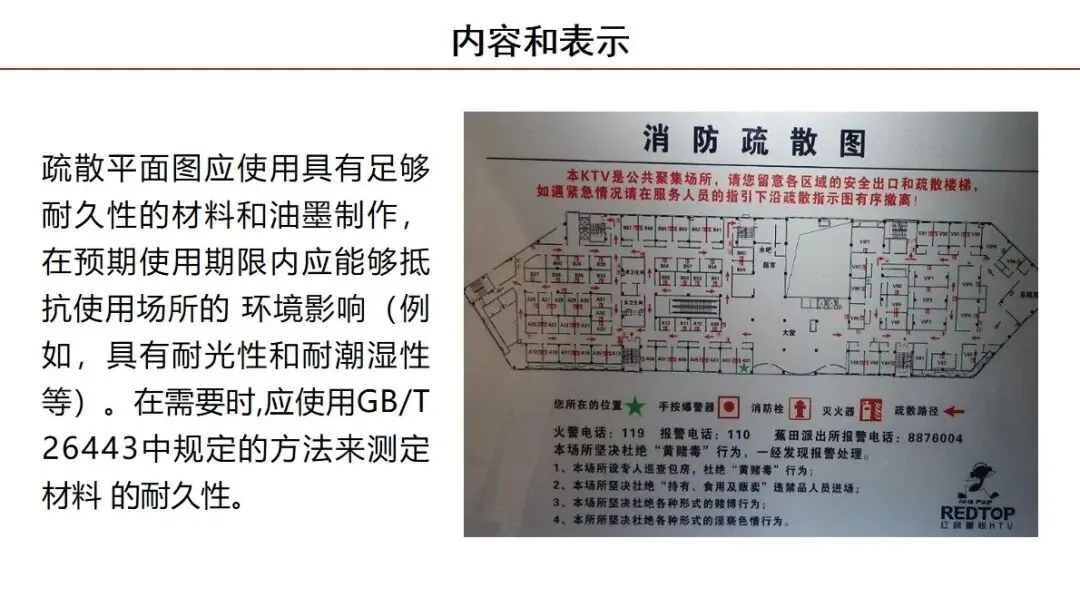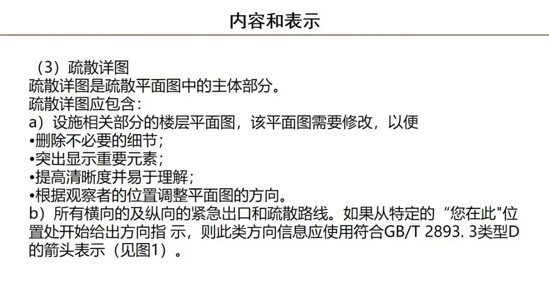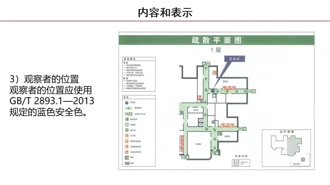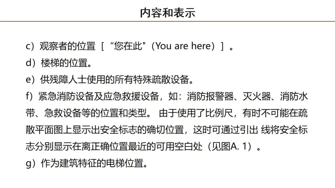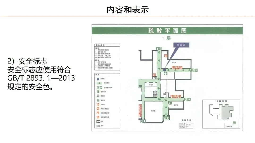 图的内容需要包括重要的元素。图名应包含“疏散方案”的中文说明,可以用英文或者民族语言表述;总平面布置图(不超过10%)应标注集合地点、设施概况、周边简图;疏散平面布置图以疏散平面布置图为主体,重点突出紧急出口,疏散路线,“您在此”标识,疏散楼梯,专用疏散设施和消防设备的位置。同时还需要配有安全告示(防火、应急说明)、说明(标识、符号的含义说明)、设计单位、设备名称、设计楼层、设计时间等。