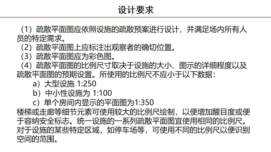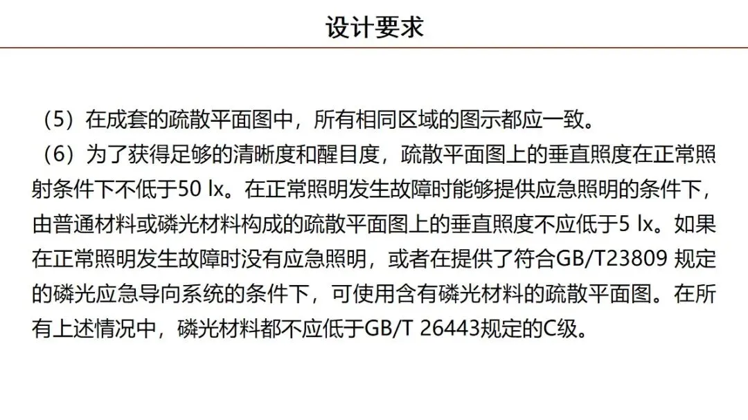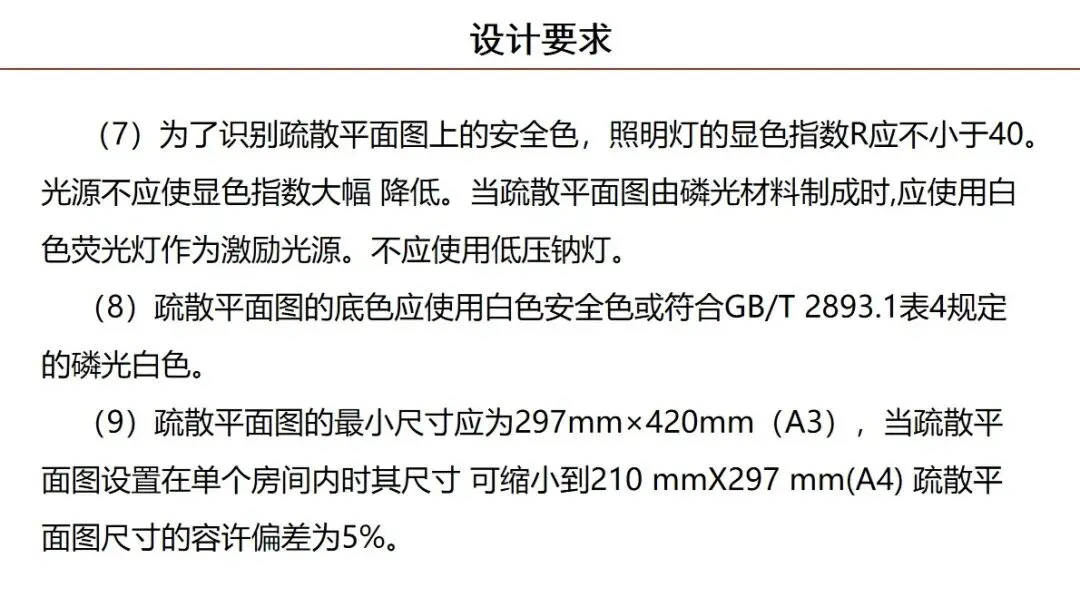 在设计过程中,需要满足多种核心需求。疏散平面布置图必须是彩色的,其绘制比例应与设施规模相适应:大型设施的绘制比例不应低于1:250,中小型设施的绘制比例不应低于1:100,个别房间的绘制比例不应低于1:350,同一地点的多张疏散平面布置图的绘制比例应一致。在尺寸上,A3规格(297mm×420mm)为标准规格,室内安装可以改为A4规格,允许偏差在5%以内。照明条件:一般环境垂直照度50 lx以上,紧急情况5 lx以上,光源的色彩表现系数 R>40,荧光粉的材质应达到有关标准。