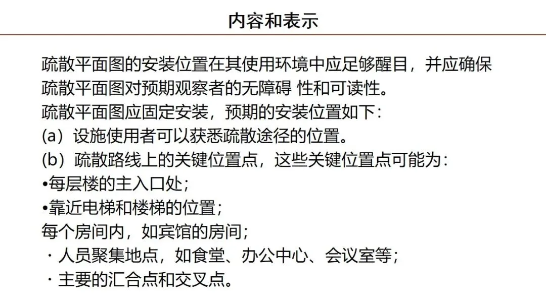 就安装地点而言,必须安装在显眼的、无遮挡的地方,最好是楼层的主要入口,电梯和楼梯的旁边,房间里,人群聚集的地方,以及路径的交叉处,以确保用户能够随时看到并且容易阅读。