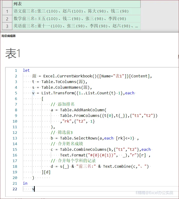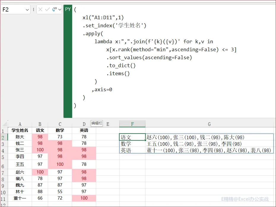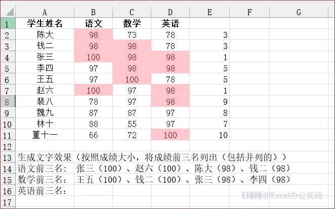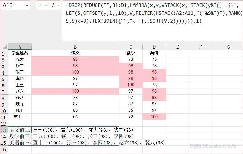 =DROP(REDUCE("",B1:D1,LAMBDA(x,y,VSTACK(x,HSTACK(y&"前三名",LET(S,OFFSET(y,1,,10),V,FILTER(HSTACK(A2:A11,"("&S&")"),RANK(S,S)<=3),TEXTJOIN({"","、"},,SORT(V,2))))))),1)
