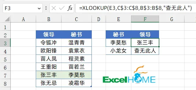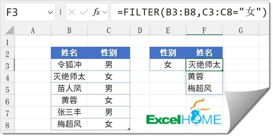 小伙伴们好啊,今天咱们分享几个常用Excel函数公式,点滴积累, 也能提高效率。如下图,F3单元格输入以下公式,向下复制到F4单元格,可以根据E列的姓名查找对应的领导姓名。=XLOOKUP(E3,C$3:C$8,B$3:B$8,"查无此人")XLOOKUP函数的作用是查找数据在一行或一列中所处的位置,并返回与之对应的另一行或另一列中的内容。常用写法为:XLOOKUP(要找谁,在哪行或哪列找,返回哪行或哪列,找不到时返回什么)公式中的E3是要查找的秘书姓名,C$3:C$8是查找的区域,B$3:B$8是要返回内容的区域。如果C$3:C$8单元格区域中的某个单元格和E3中的内容相同,就返回B$3:B$8单元格区域对应位置的领导名称。如果C$3:C$8单元格区域中没有和E3相同的内容,公式返回“查无此人”。如下图,需要从左侧数据表中提取出性别为“女”的全部记录,可以使用以下公式。FILTER的作用是筛选符合条件的全部记录,第一参数为要筛选的区域,第二参数是筛选的条件。第三参数用于指定在没有符合条件的记录时,公式返回的内容,如果省略,默认返回错误值#CALC!如下图,要根据E3单元格的商品名称,查询对应的销售经理。公式为:=LOOKUP(1,0/(C2:C10=E3),A2:A10)=LOOKUP(1,0/(条件区域=条件),查询区域)4、根据出生年月计算年龄