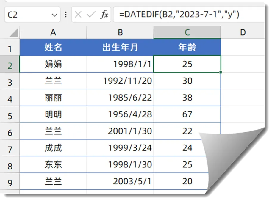 如下图,希根据B列的出生日期,计算截止到23年7月1日时的年龄。
