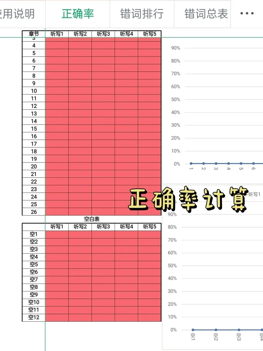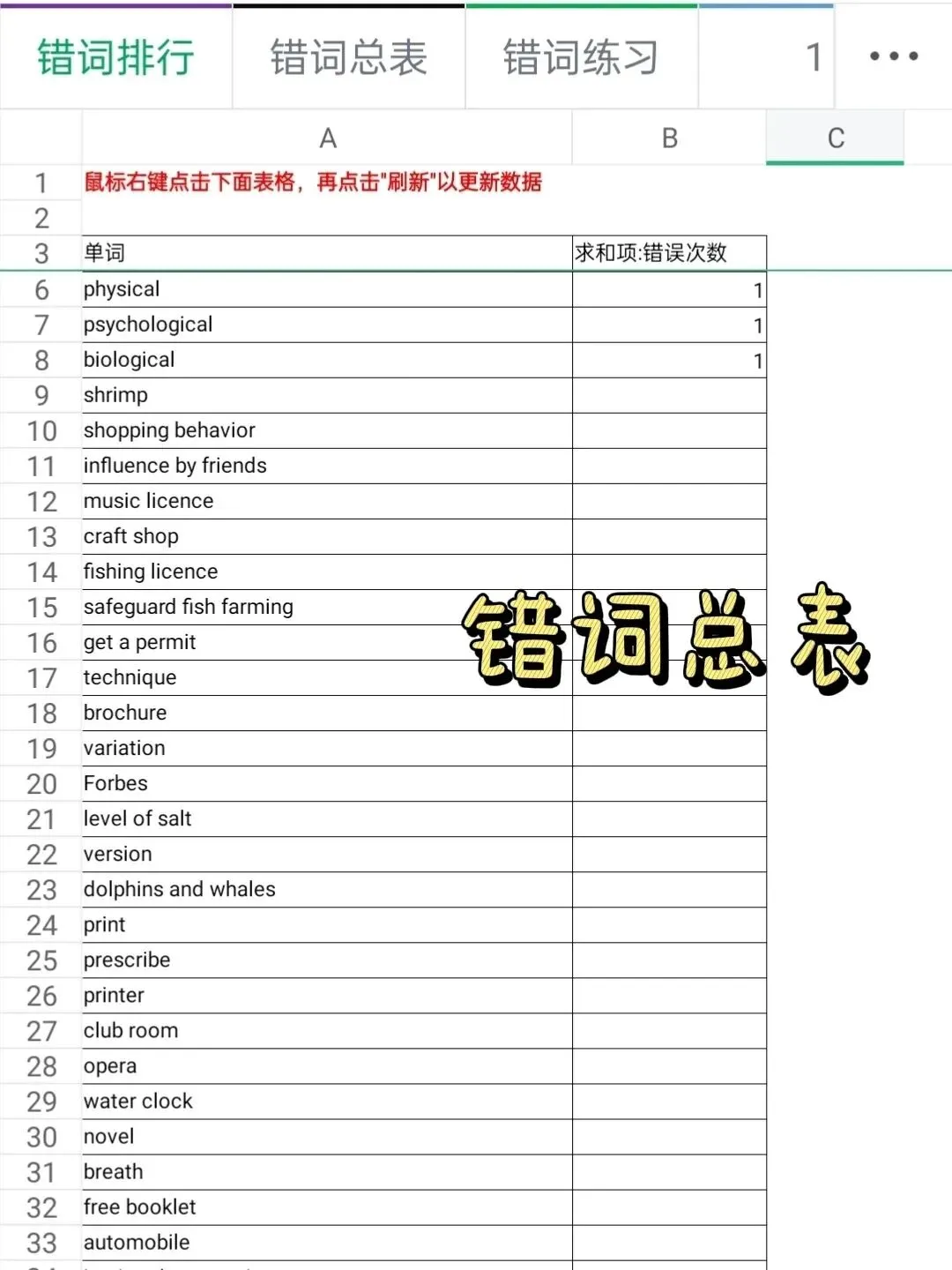 4.接下来,把易错词快速学习一遍,直接用语料库Excel表格它更加方便了解自己错词和正确率,及时发现错误,甚至可以根据近期的正确率来进行统计分析