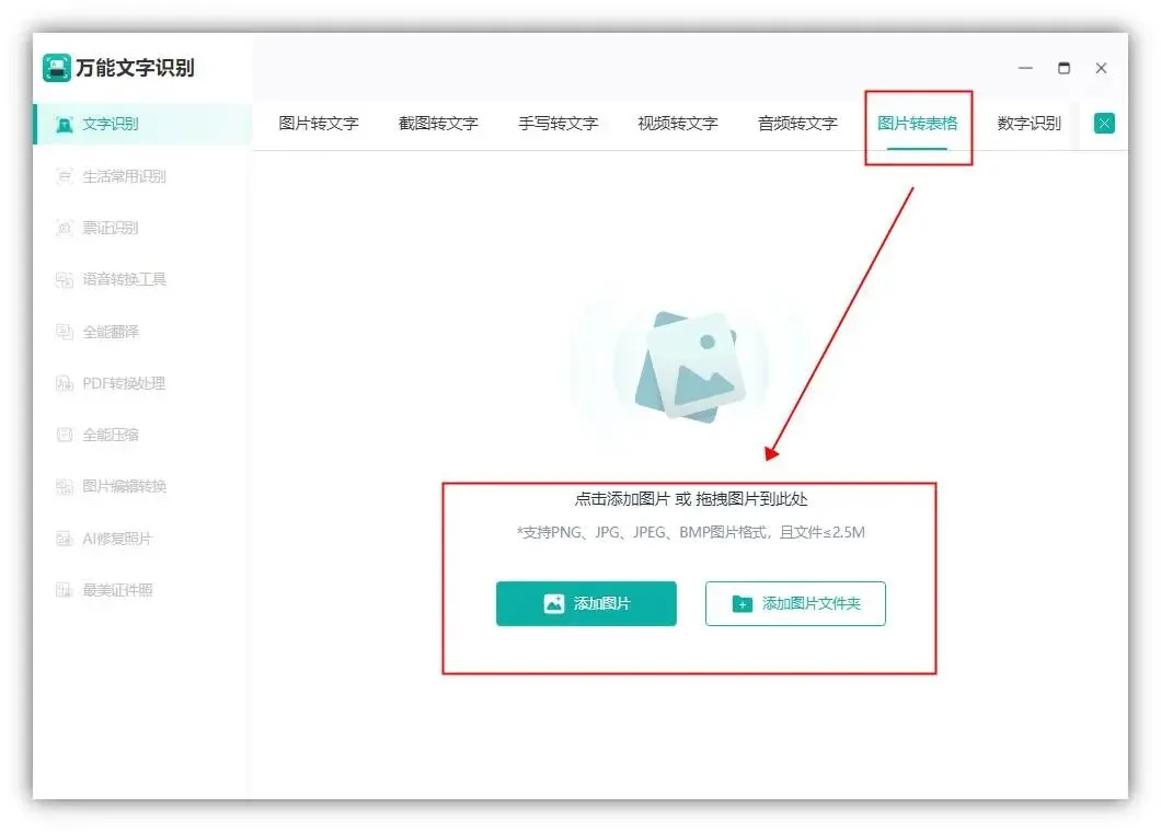 ①打开这个工具,找到【图片转表格】功能,点击【添加图片】或【添加图片文件夹】上传需要转换的图片。