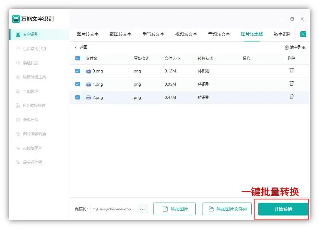 还可以使用万能文字识别,因为它不仅可以识别图片、音视频中的文字内容,还可以将图片转换为表格,一键即可批量实现转换操作,非常简单。
