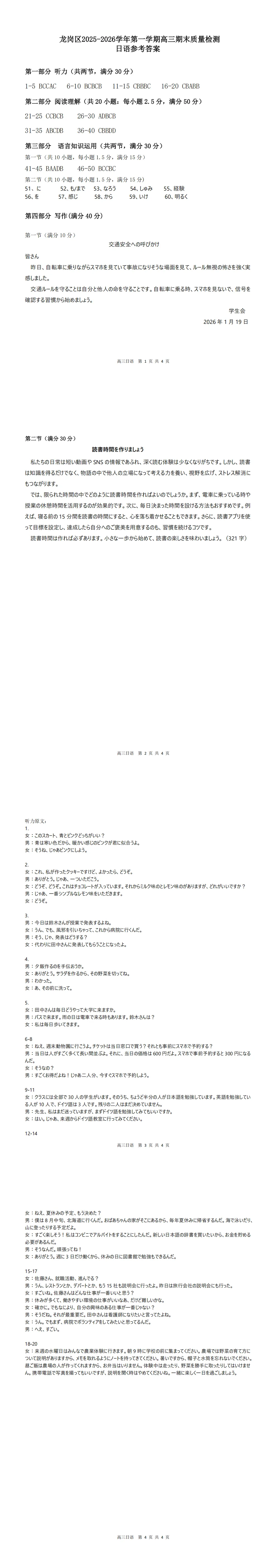 WORD广东省深圳龙岗2026届高三1月日语试题(作文:倡议书;読書時間を作りましょう)+听力+答案及听力原文