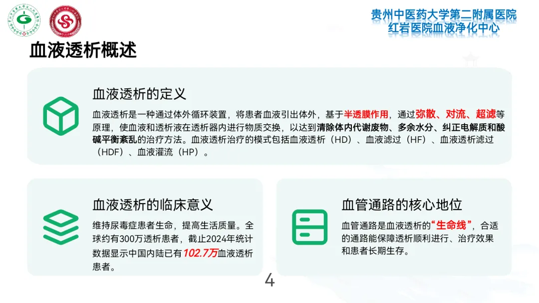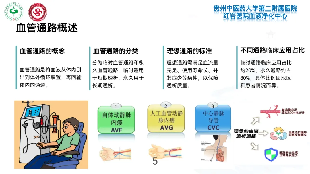 血液透析通路是终末期肾病患者的“生命线”,需满足血流量充足(200-300ml/min)、可反复使用且并发症少的要求。临床根据使用周期分为临时通路与长期通路,选择需结合患者病情、血管条件及预期寿命综合判断。