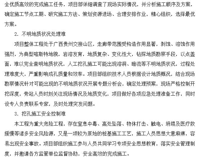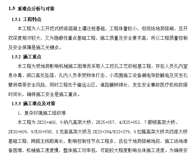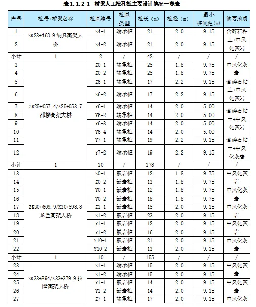 根据现场勘察,部分桩基所处区域地形陡峭,成孔无法采用机械施工,包括端承桩16根、嵌岩桩14根,共计30根,其中桩基桩径为1.8m~2.2m,桩长为12~25m,分别分布在纳凡高架、都楼高架、龙登高架及拉隆高架大桥上,根据工程地勘报告判断人孔挖孔桩所在区域基本地质为浅层含碎石粘土+中风化灰岩或中风化灰岩,岩质单一且均无溶洞,未见地下瓦斯相关报告,且不在《广西壮族自治区住房和城乡建设厅关于严格限制使用人工挖孔灌注桩的通知》(桂建管〔2014〕87号)的禁止范围内,拟采用人工挖孔方式成孔。桥梁立面图及桩位基本地质情况详见附件7.6。