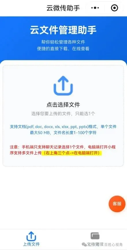 公众号不能上传附件,应该让很多平台管理者都很头疼的事,各种报名表、通知文件都是Word、Excel、PPT等文件,真的不知道该怎么办?近期发现了一个小工具,云微传助手非常好用,而且是免费的哦!云微传助手是一款专为公众号运营者设计的小程序,核心功能就是让你能在公众号文章中直接插入可下载的附件。操作简单,完全免费,支持50MB以内的文件上传,读者无需跳转即可直接下载或在线查看。电脑:可以在上传微信聊天记录文件的同时,还可以上传电脑里编辑好的文档,非常方便。云微传助手的主要特点: