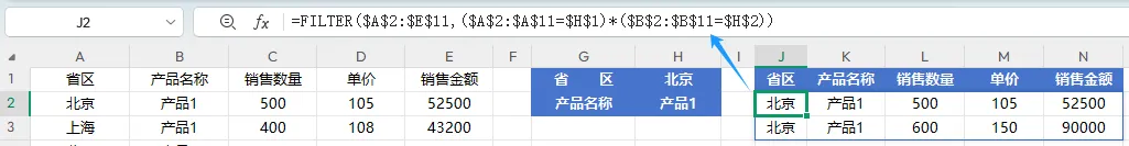 FILTER是Excel 365和Excel 2021中引入的动态数组函数,它可以根据指定条件从数据区域中筛选出符合条件的记录,结果会自动溢出到相邻单元格。函数语法=FILTER(被筛选的数据区域, 条件1 * 条件2 * ... , "无结果提示"),今天就用几个示例给大家详解 示例1:根据F2单元格的部门从左侧基础数据中提取对应部门的员工入职信息。E4=FILTER(A2:C8,B2:B8=F1)①数据筛选区域:A2:C8,即从该区域筛选需要的数据;②条件:B2:B8=F1,即要求B列的部门等于F1单元格列示的部门。示:2:根据选择的目标城市和产品从左侧原始数据中筛选出对应省区、对应产品的销售数据。J2=FILTER($A$2:$E$11,($A$2:$A$11=$H$1)*($B$2:$B$11=$H$2))①被筛选的数据区域:$A$2:$E$11,即从该区域筛选目标数据;②条件1:($A$2:$A$11=$H$1),要求筛选A2-A11中省区等于H1单元格的数据;③条件2:($B$2:$B$11=$H$2),要求筛选B2-B11中产品等同于H2单元格的数据案例3:多条件满足一个时候的筛选(或者筛选)