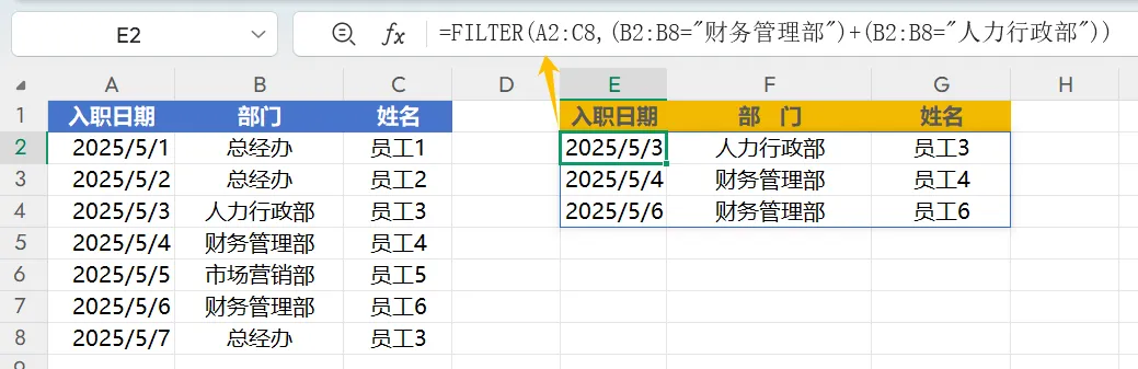 E2=FILTER(A2:C8,(B2:B8="财务管理部")+(B2:B8="人力行政部"))