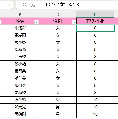 如下图所示,要根据C列的性别,在D列填充每小时的工资数。