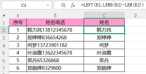以上公式核心是利用LEN与LENB函数的字节/字符计数差异定位姓名长度:LEN函数统计字符数(每字符计1),LENB函数统计字节数(中文计2、单字节字符计1),两者差值为中文姓名字符数,再用LEFT函数从左侧截取对应内容。