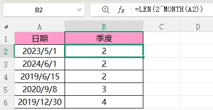 LEN函数统计幂次结果的字符长度,最终长度恰好对应季度(1-3月长度为1→Q1,4-6月长度为2→Q2,以此类推)。