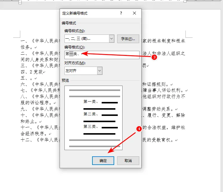 3. 修改“编号格式”为“第一类、”