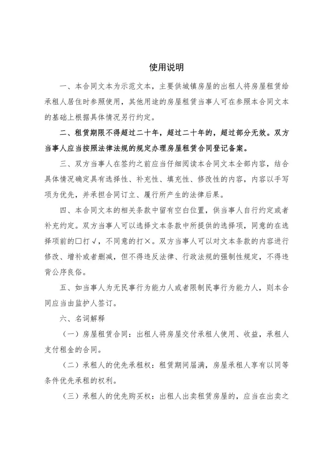 一、本合同文本为示范文本,主要供城镇房屋的出租人将房屋租赁给承租人居住时参照使用,其他用途的房屋租赁当事人可在参照本合同文本的基础上根据具体情况另行约定。