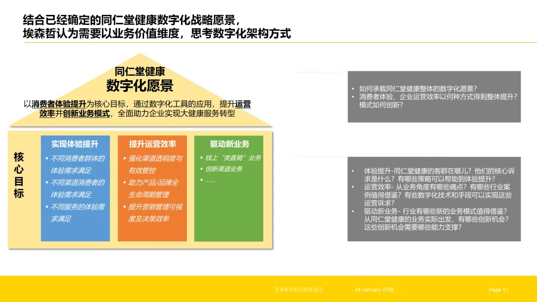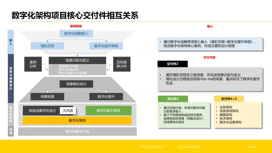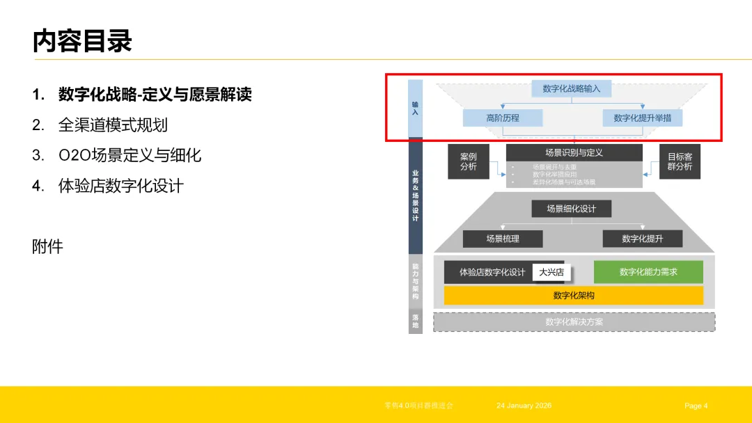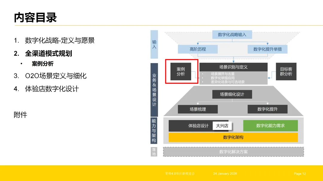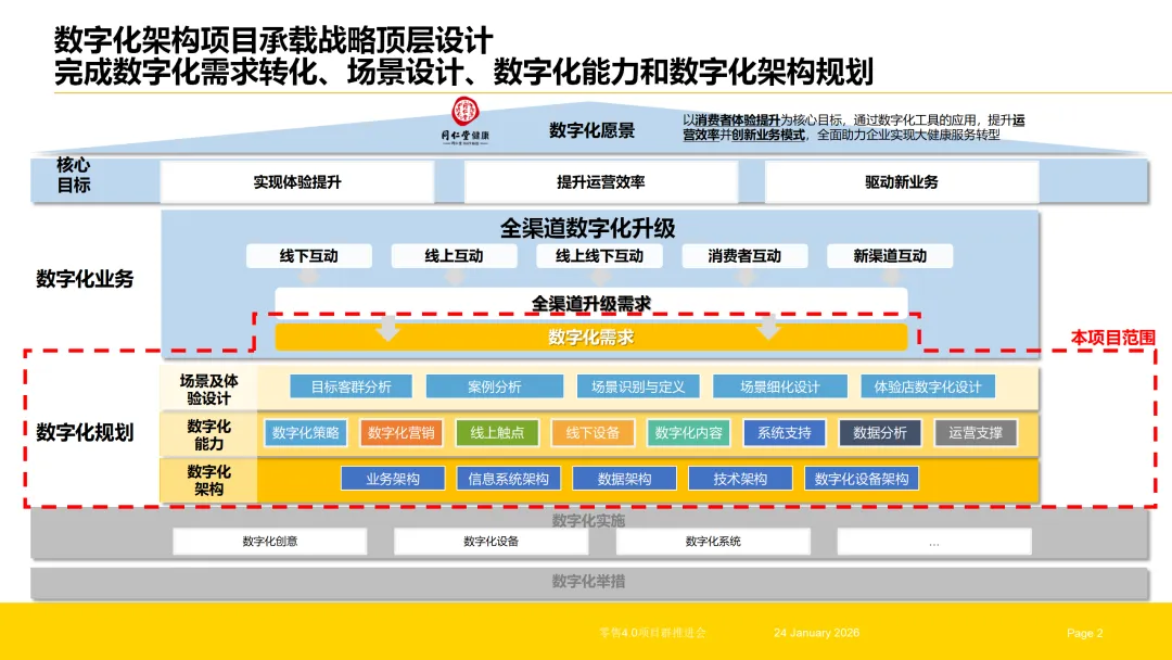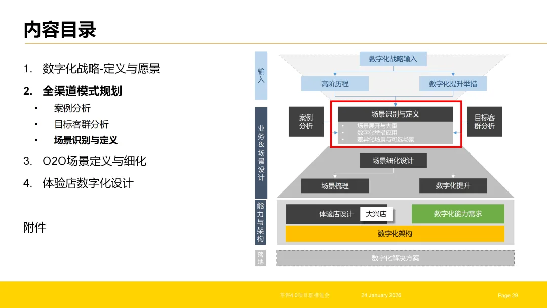 企业数字化转型是一个系统性工程,需以战略为引领,以架构为核心,以渠道与场景为落地载体,形成“战略解读—架构构建—渠道融合—场景深耕—终端赋能”的全链路体系。数字化架构项目作为核心枢纽,既要承接战略顶层设计,实现需求的系统化转化与能力的结构化构建,又要支撑全渠道、O2O场景与体验店的数字化落地,打通从战略到执行的每一个环节。唯有实现各环节的协同联动,才能让数字化转型真正落地见效,为企业构建可持续的竞争优势。