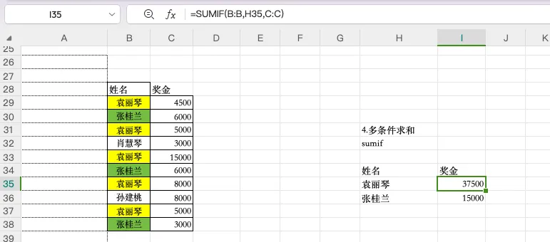 2、多条件求和(sumifs ),适用于多个条件求和,这是最简单且易记的方法。与其类似还有数组乘积求和函数SUMPRODUCT,大家也可以去了解,案例:
