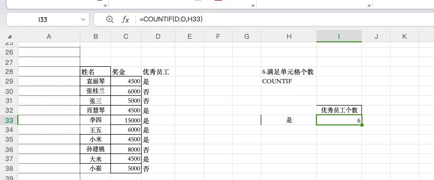 3、满足条件计数(countif)此函数平时很少用,毕竟有很多简单函数可以替代,一般用于辅助的多,案例: