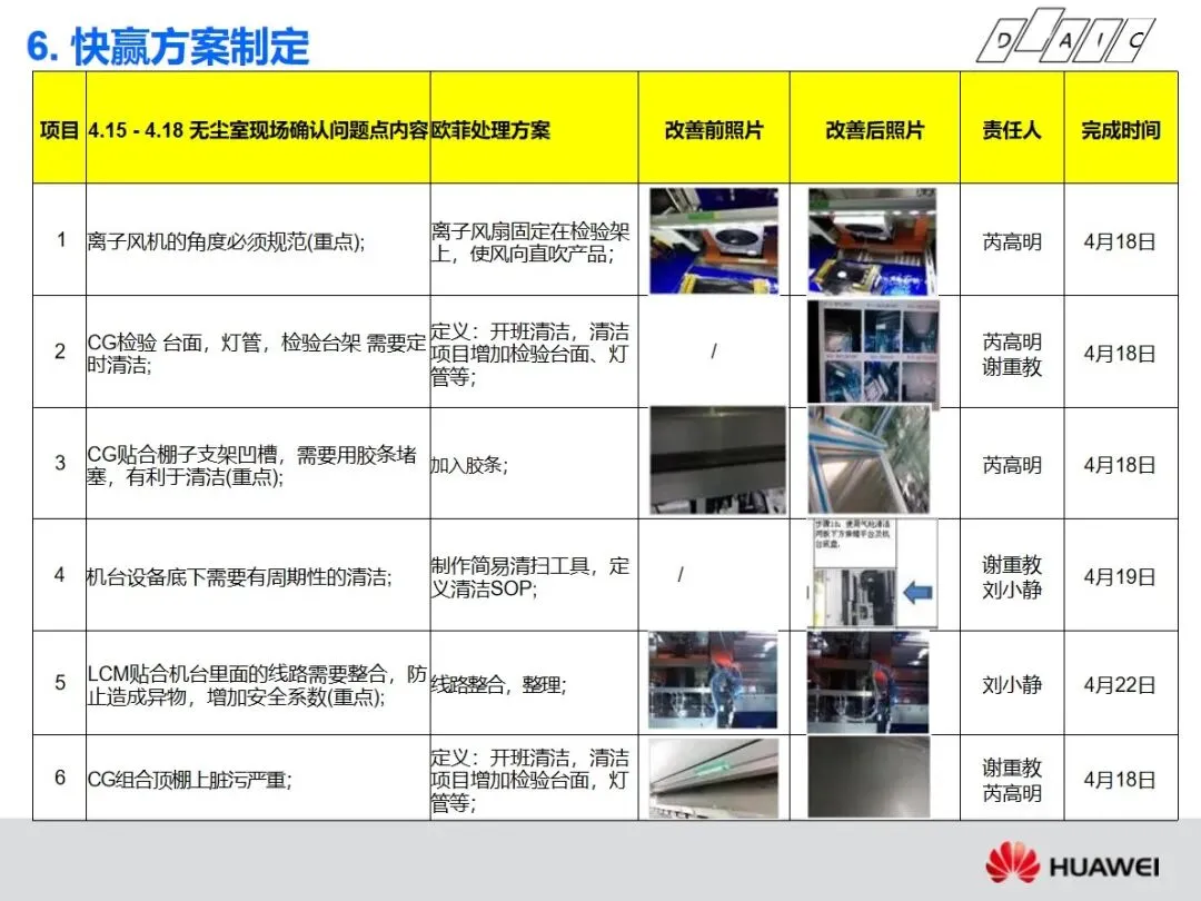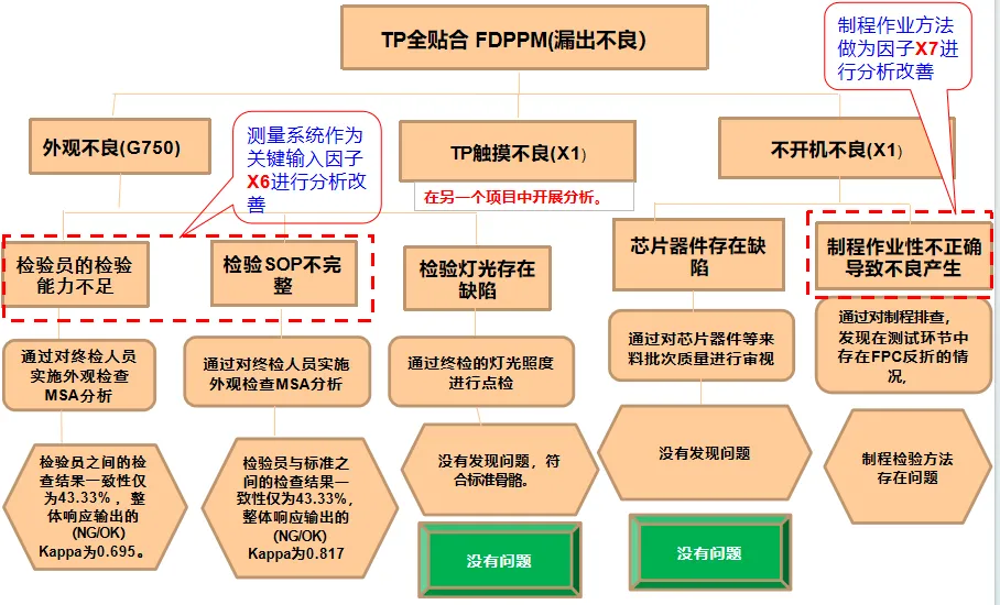 实施过程中,项目组先绘制SIPOC图与制程流程图,通过PFMEA分析锁定7个关键输入因子,包括贴合区域环境洁净度、来料质量、腔体清洁度、检验测量系统能力等。快速制定并落地多项快赢方案,规范离子风机角度、清洁检验台面与灯管、堵塞贴合棚子支架凹槽等。