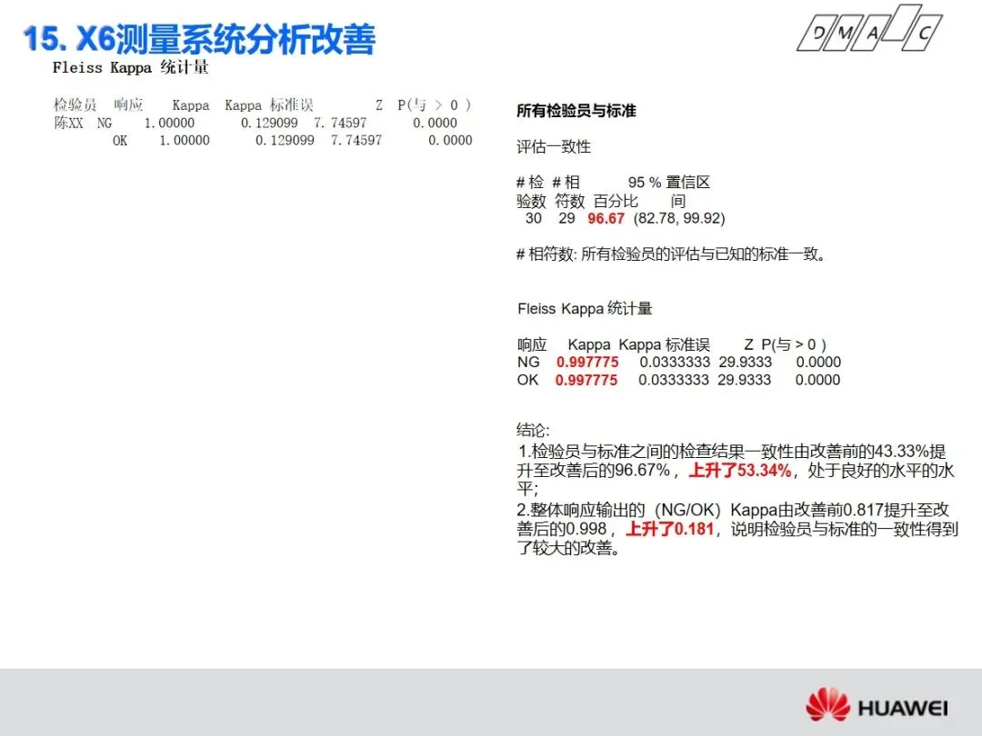针对关键因子,项目组推出系列改善措施:更换机台防静电围帘、为真空波纹管道加装防护罩,制定机台顶部与底部每周清洁制度;将TP来料检验的LED灯改为卤素灯,提升缺陷检出率;OCA上线前增加人员检验,整改机台气管布线避免摩擦产尘,制定腔体专门清洁SOP;优化外观检验测量系统,检验员与标准一致性从43.33%提升至96.67%;完善作业SOP,规范取放片、覆膜等操作。