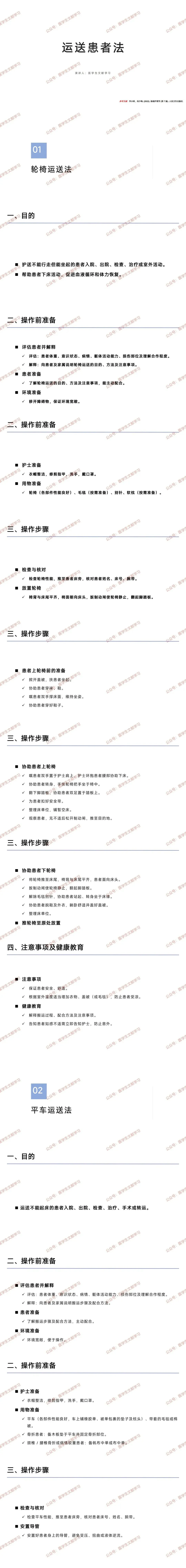 - 整理与运送:整理床单位为暂空床;护士站患者头部观察病情,平车小轮在前,低速推行,上下坡时患者头部居高处,颅脑损伤 / 昏迷患者头偏向一侧,颈椎损伤患者头部保持中立位。