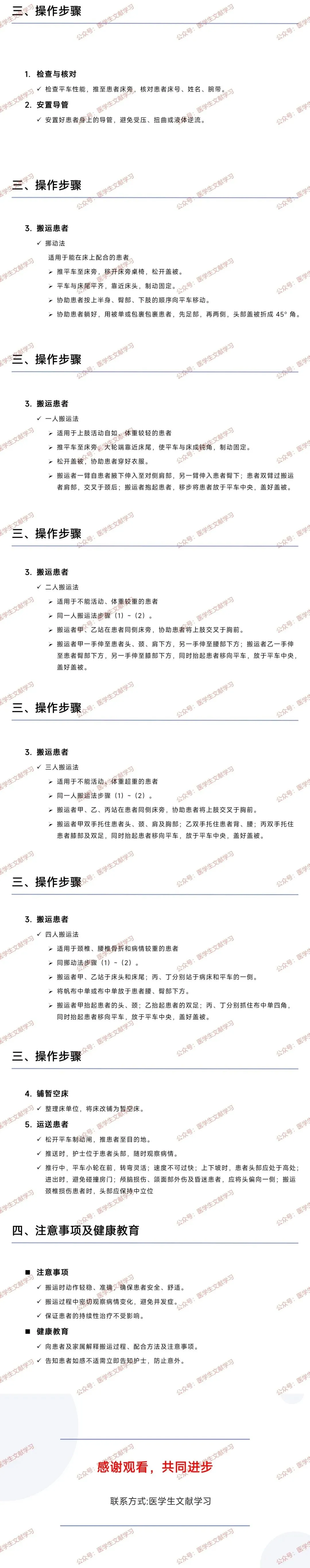 - 评估与解释:评估患者体重、病情、活动能力等,向患者及家属说明搬运步骤与配合方法。